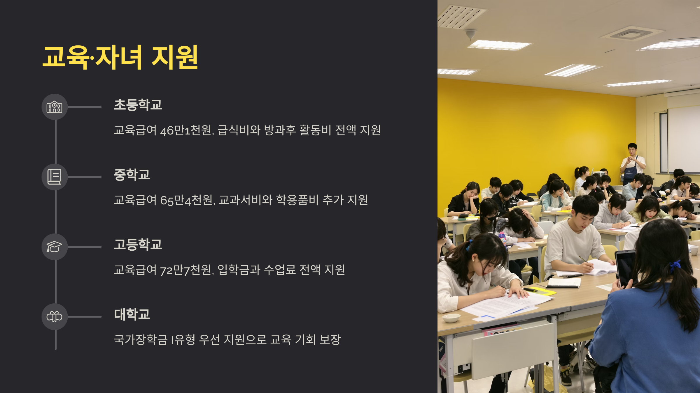 기초생활수급자 가정의 자녀는 교육급여를 통해 학비 부담 없이 학교를 다닐 수 있어요. 초·중·고등학생은 물론 대학생에게도 다양한 혜택이 주어져요.
