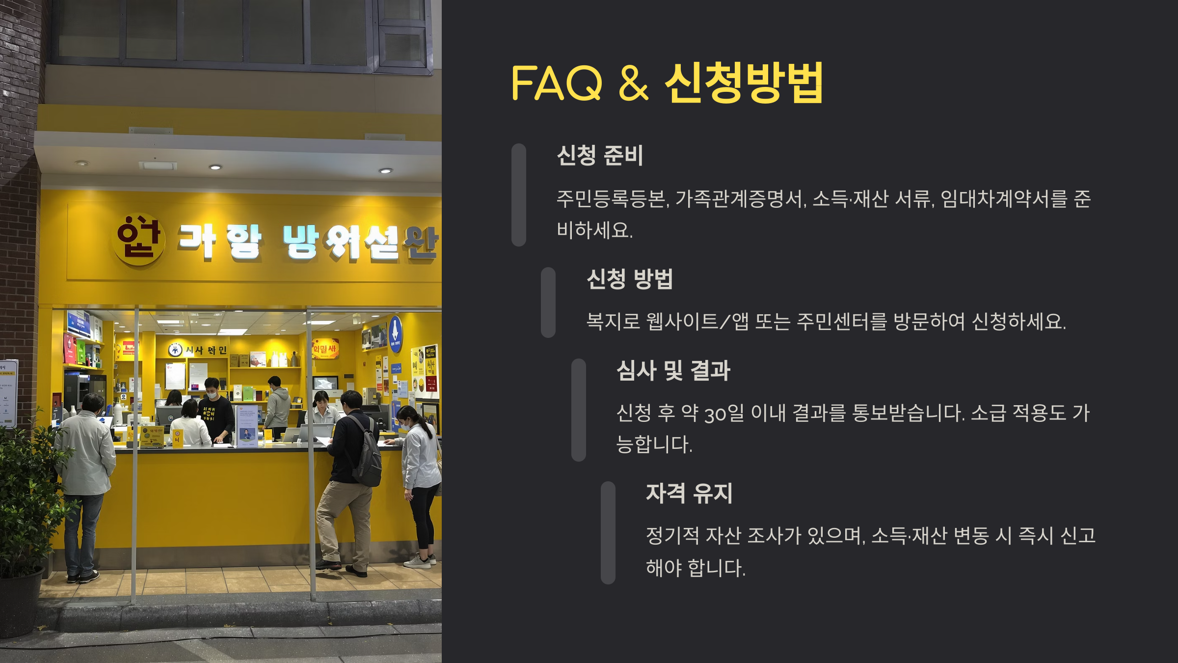 A1. 가까운 읍면동 주민센터에 방문해 신청서를 작성하고, 소득·재산 조사 과정을 거쳐야 해요.