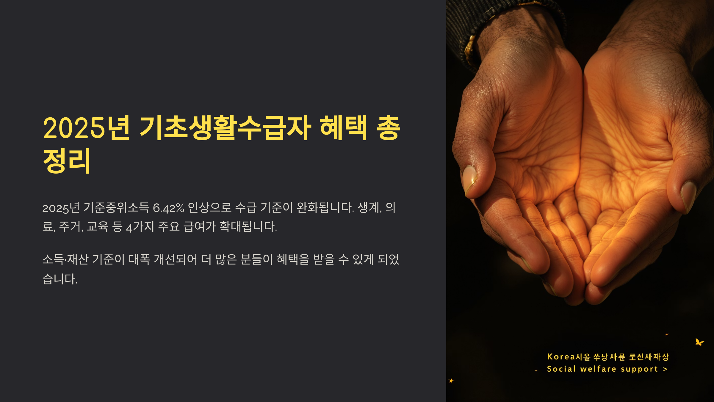 2025년 기준으로 소득인정액이 중위소득의 30~50% 이하일 경우 생계급여, 의료급여, 주거급여, 교육급여 등 4대 급여를 받을 수 있어요.