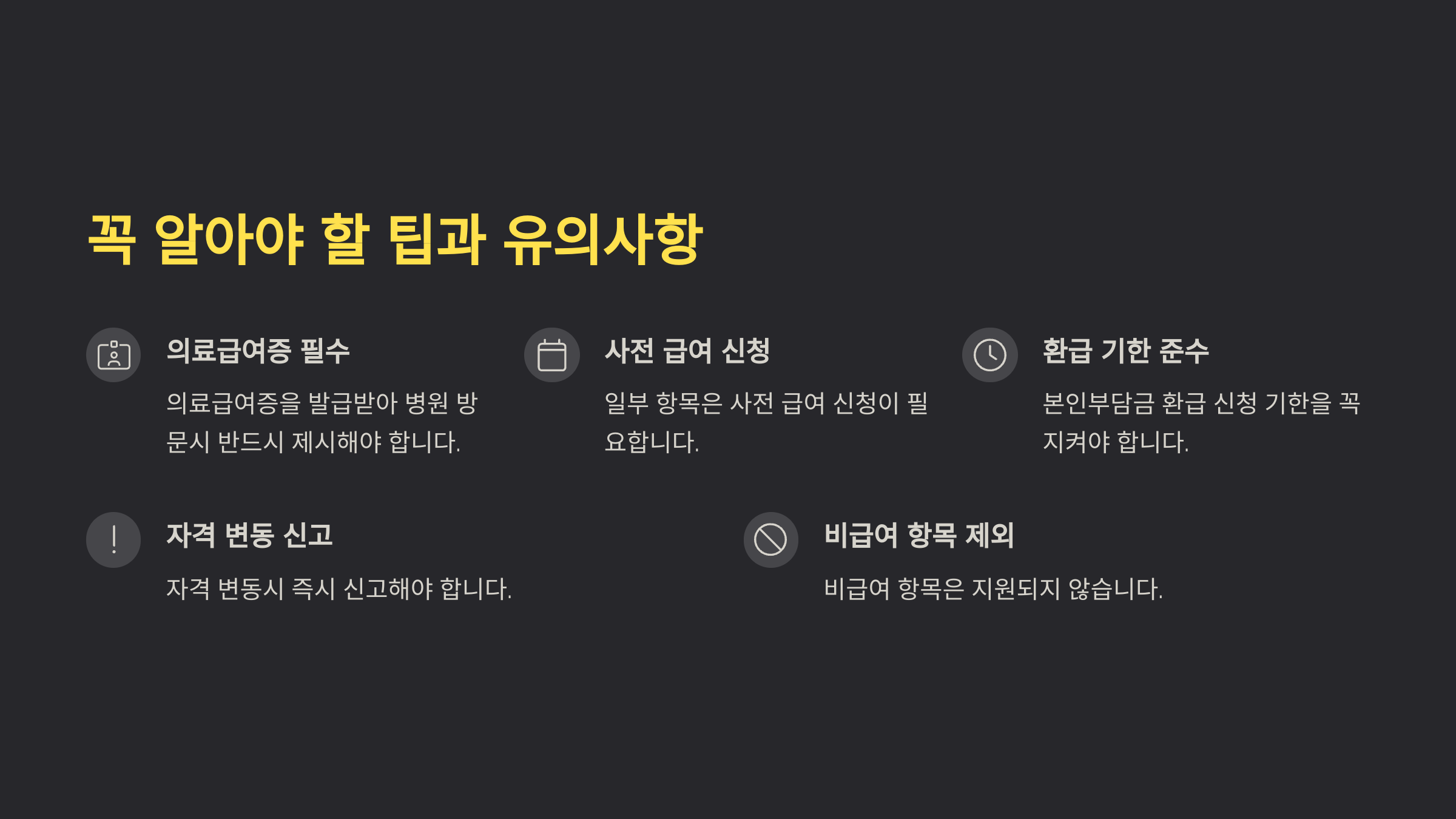 또한 질병에 따라 추가적인 지원이나 간병비, 검사비, 입원비까지도 지원이 가능해요. 특히 암, 희귀질환, 중증질환의 경우에는 본인부담 경감 및 병원비 전액 지원이 가능한 경우도 있으니 꼭 확인해야 해요.
