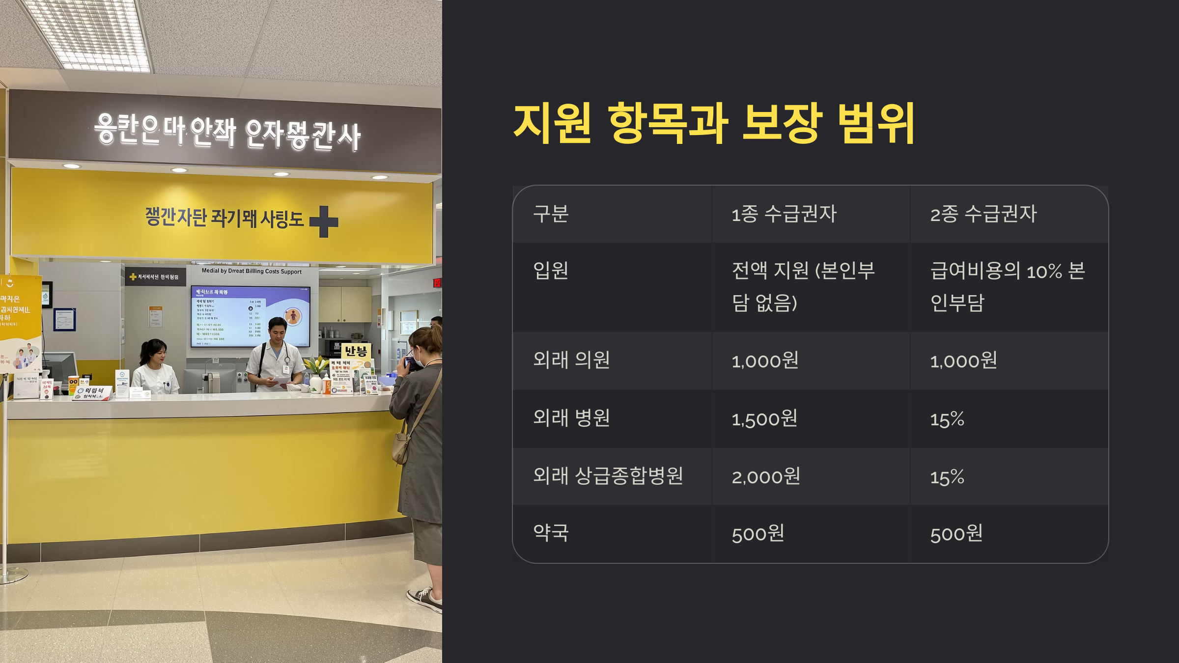 이처럼 수급자의 유형에 따라 지원 내용이 다르기 때문에, 병원 방문 전 미리 확인하는 것이 중요해요. 복지로 홈페이지 또는 129 보건복지상담센터에서도 확인할 수 있답니다.