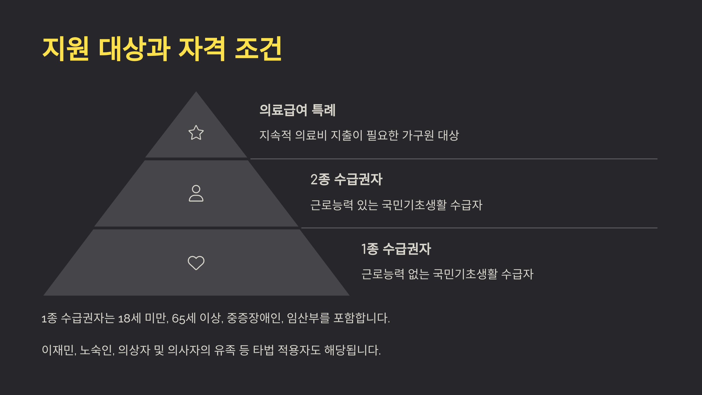 기초생활수급자 의료비 지원은 기본적으로 ‘의료급여 수급권자’를 대상으로 해요. 이는 국민기초생활보장법에 따라 생계, 주거, 교육, 의료급여를 받는 사람들 중 '의료급여'를 받을 수 있도록 선정된 분들이 포함돼요.
