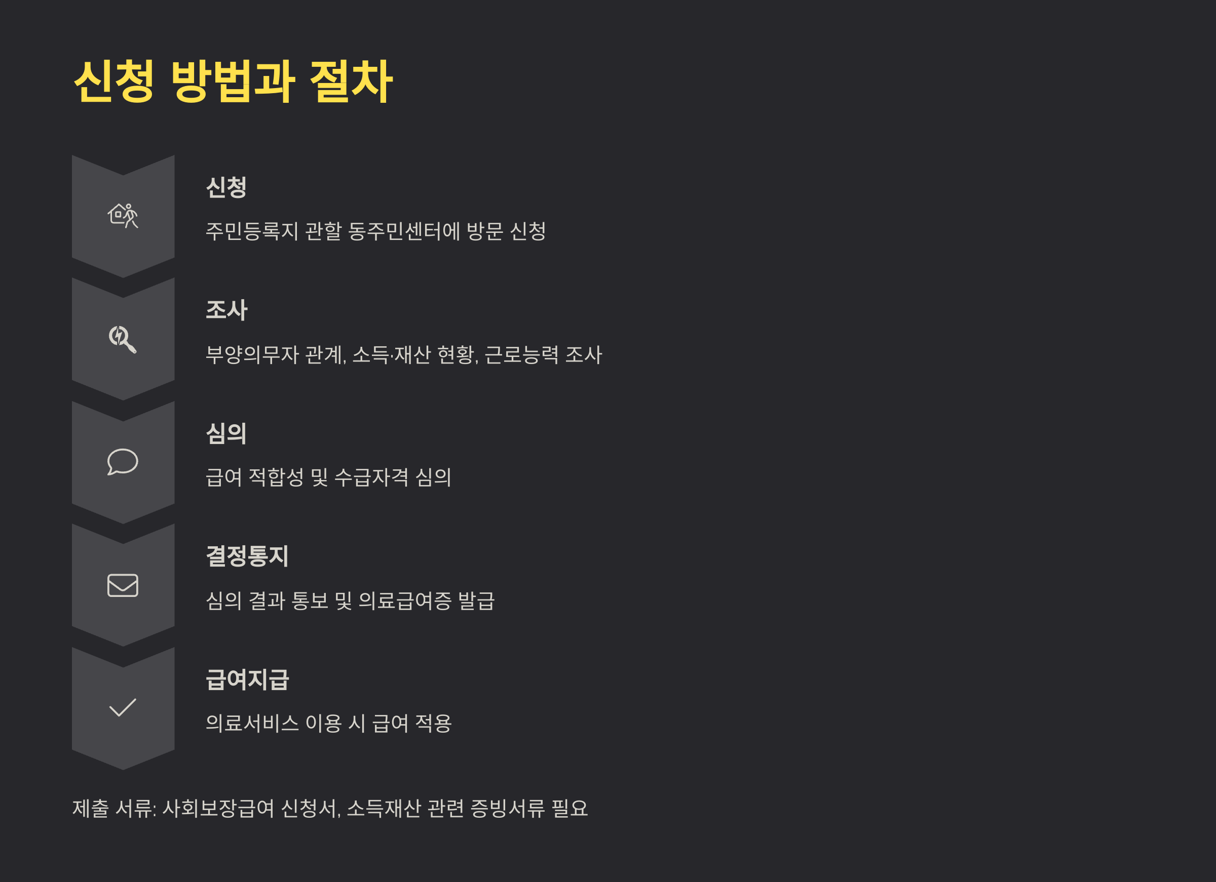 주민센터에 방문하면 먼저 소득, 재산, 가족관계 등의 조건을 기준으로 수급자 여부를 확인하게 돼요. 이후 의료급여 자격이 있는 경우, 별도 신청 없이 바로 지원이 가능해요. 의료기관에서 자동으로 급여 처리되기 때문이에요.
