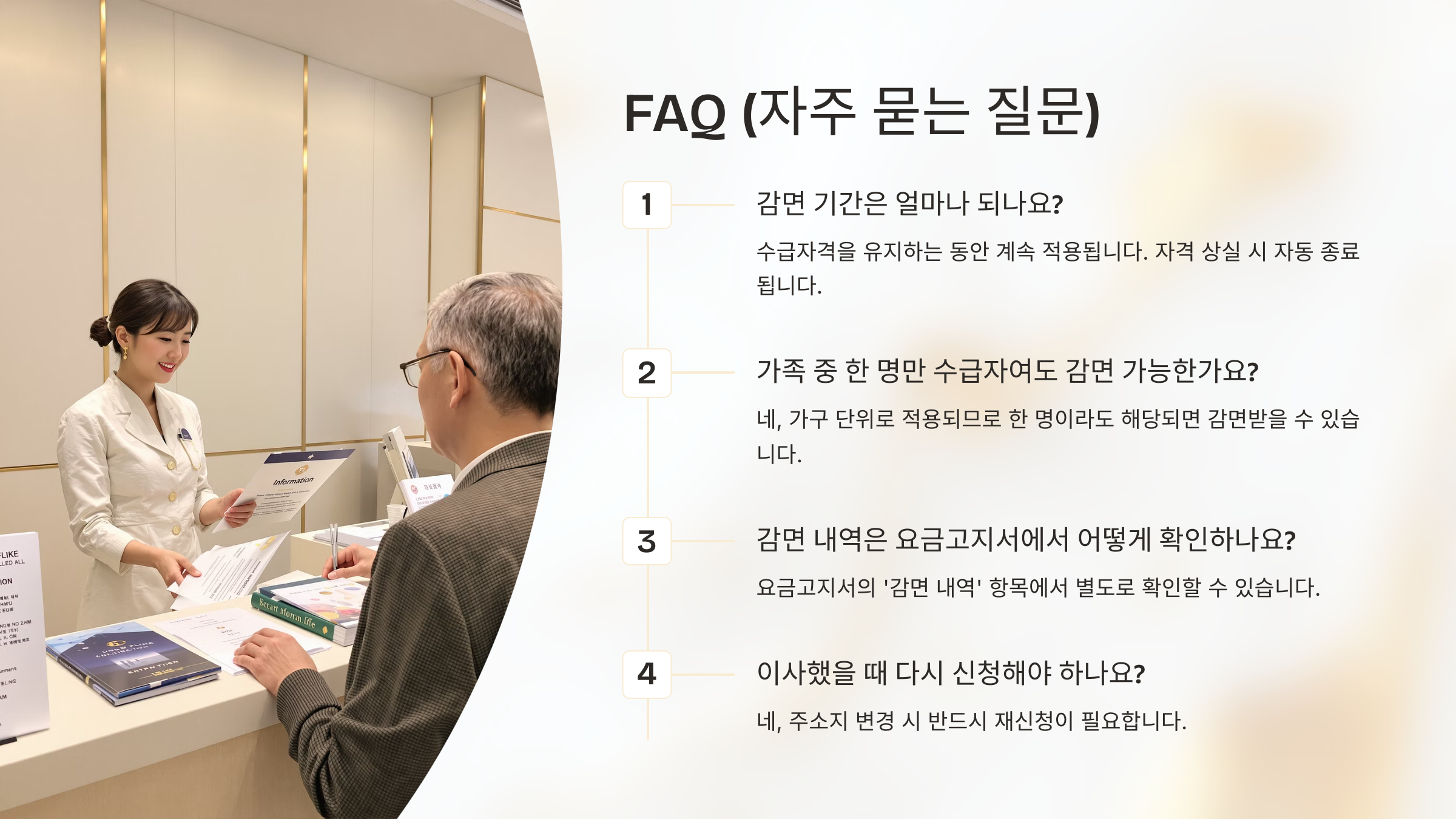 먼저, 감면 신청은 한 번만 하면 자동 갱신되는 경우가 많지만, 수급자 자격이 변경되면 반드시 다시 신청해야 해요.