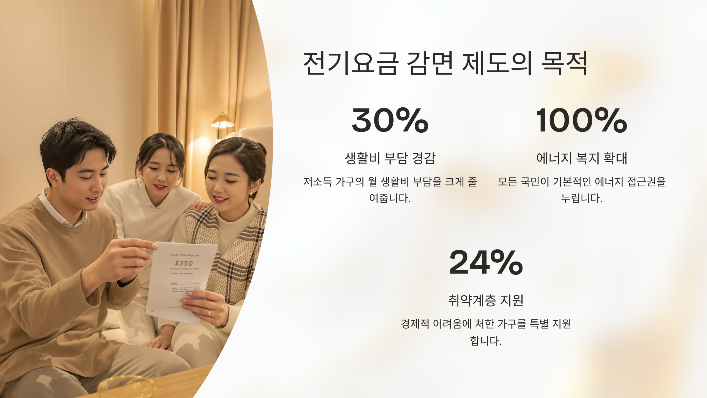 전기요금 감면 제도는 에너지 복지를 실현하기 위한 국가 정책 중 하나예요.
