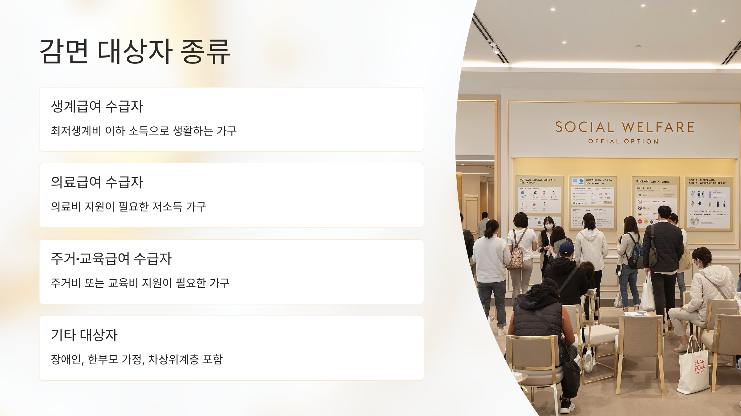 의료급여 수급권자와 생계·주거급여 수급자는 가장 큰 감면 혜택을 받을 수 있어요.