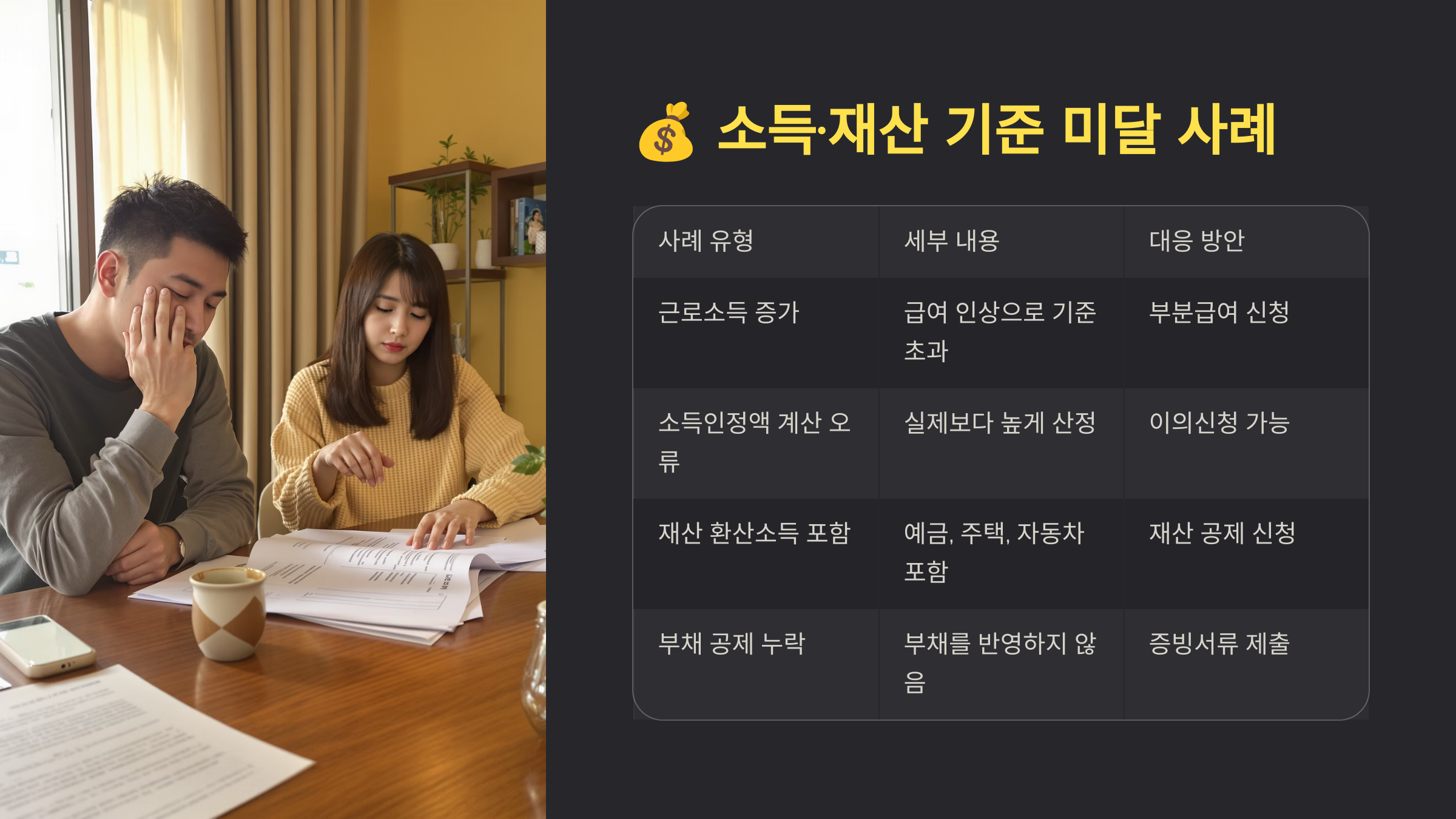 결과적으로 많은 사람들이 자신은 조건에 맞는다고 생각하지만, 실제 심사에서는 서류상 소득이나 재산이 기준을 넘는 것으로 판단되어 탈락되는 경우가 많답니다.