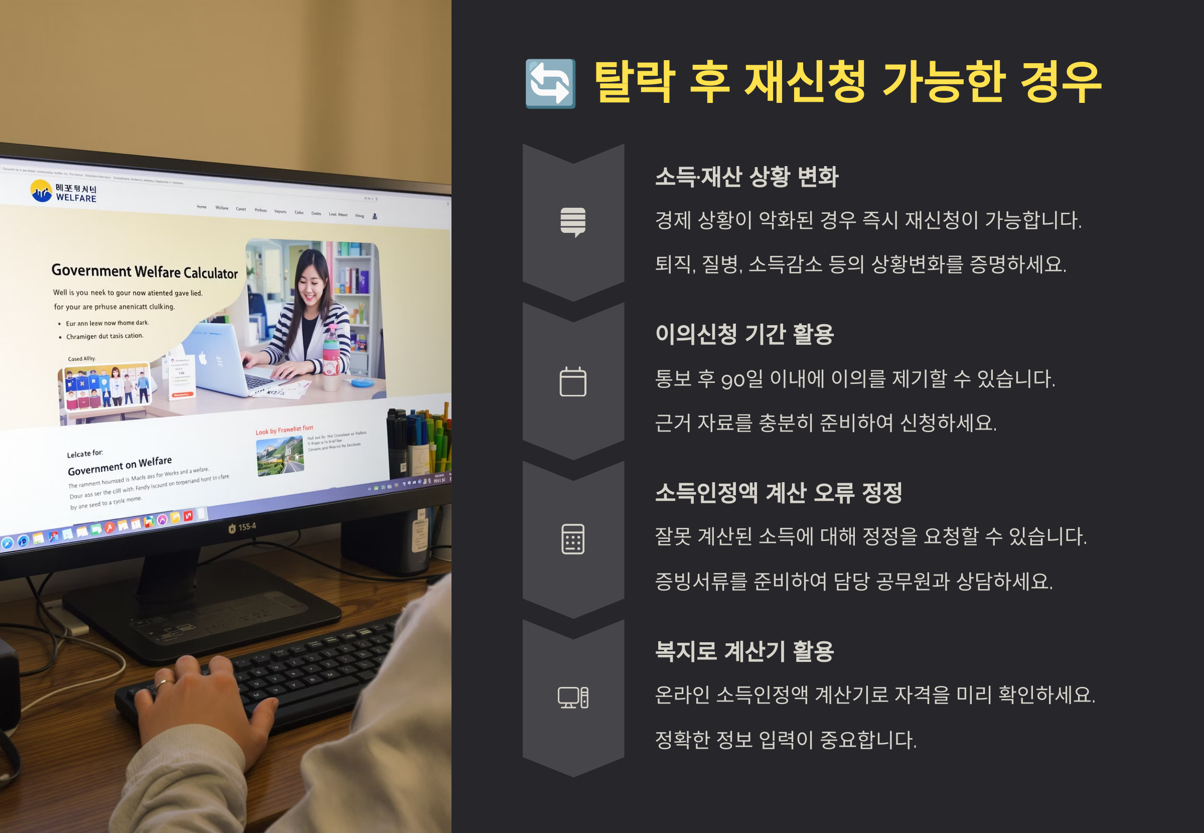기초생활수급자 심사에서 탈락했다고 해서 끝은 아니에요. 조건이 바뀌거나, 기준이 완화되면 다시 신청해서 받을 수 있답니다. 재신청은 누구나 가능해요!