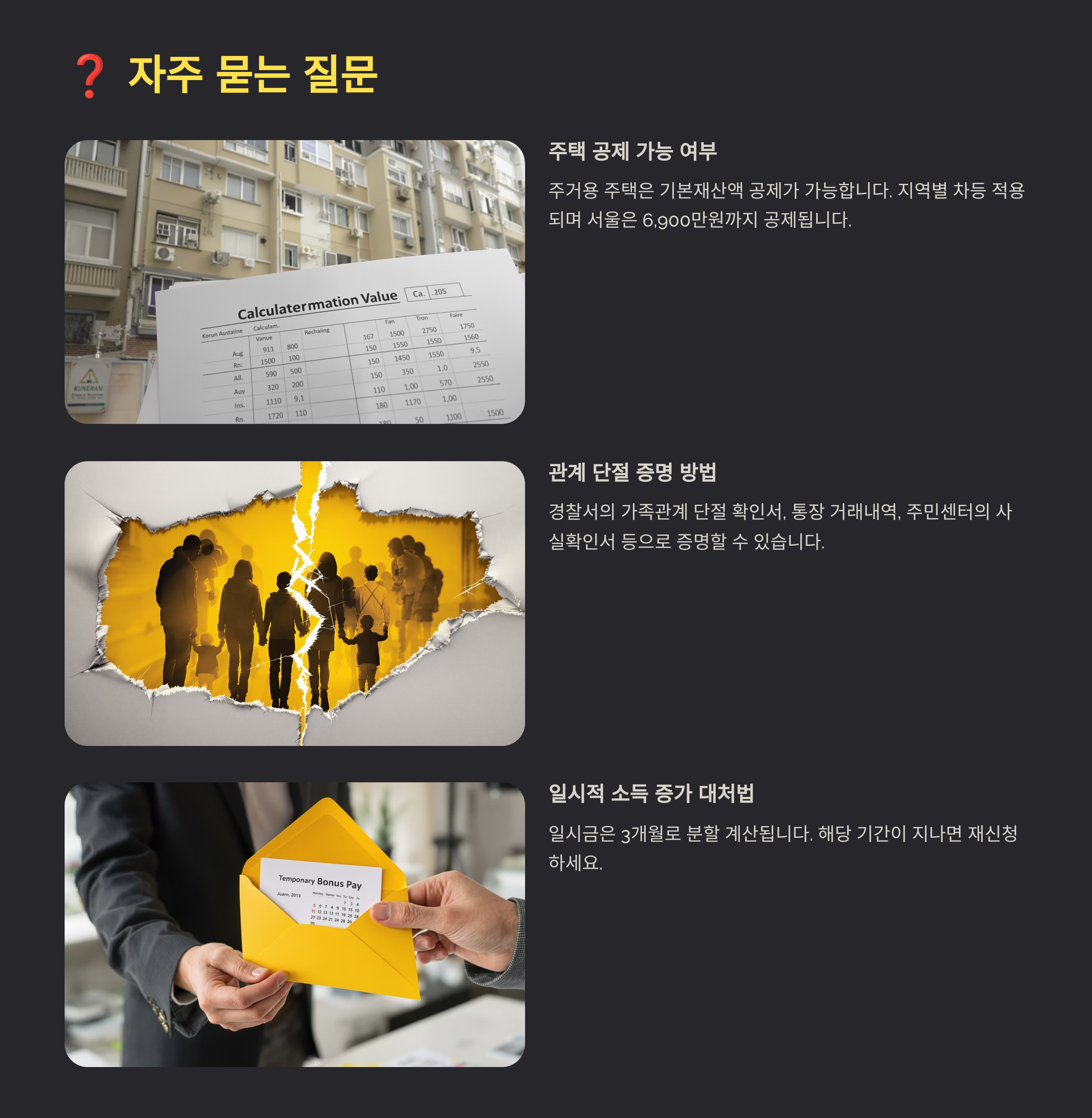 특히 자녀가 직장에 다니며 월 소득이 일정 금액을 초과하거나, 주택·자동차 등 자산이 있으면 수급 신청자 본인의 상황이 아무리 열악해도 탈락할 수 있어요.