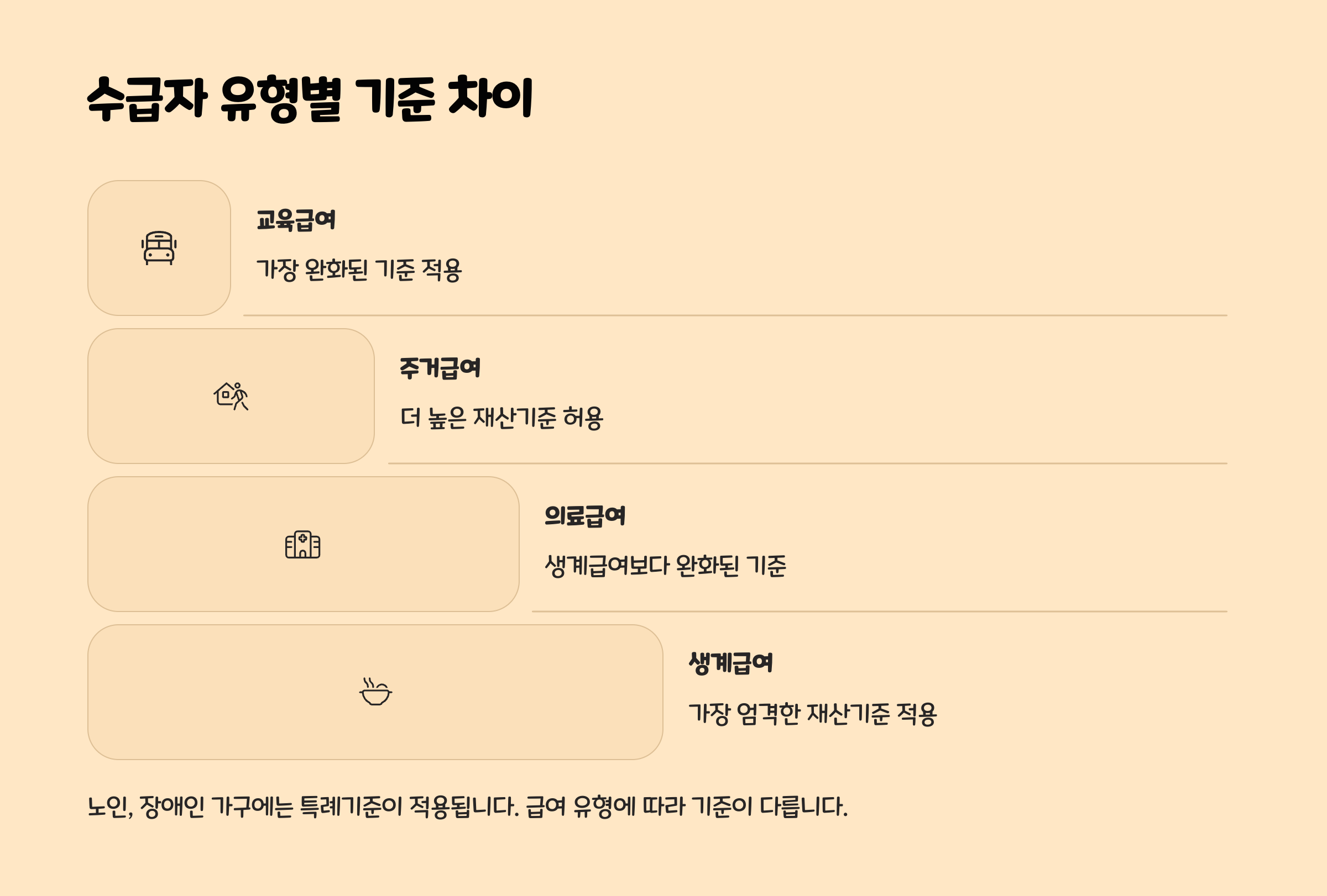 기초생활수급자 안에서도 유형이 다양해요. 생계급여, 의료급여, 주거급여, 교육급여 등 각각의 급여별로 요구되는 기준이 달라요. 예를 들어 생계급여는 가장 엄격한 기준이 적용돼요.