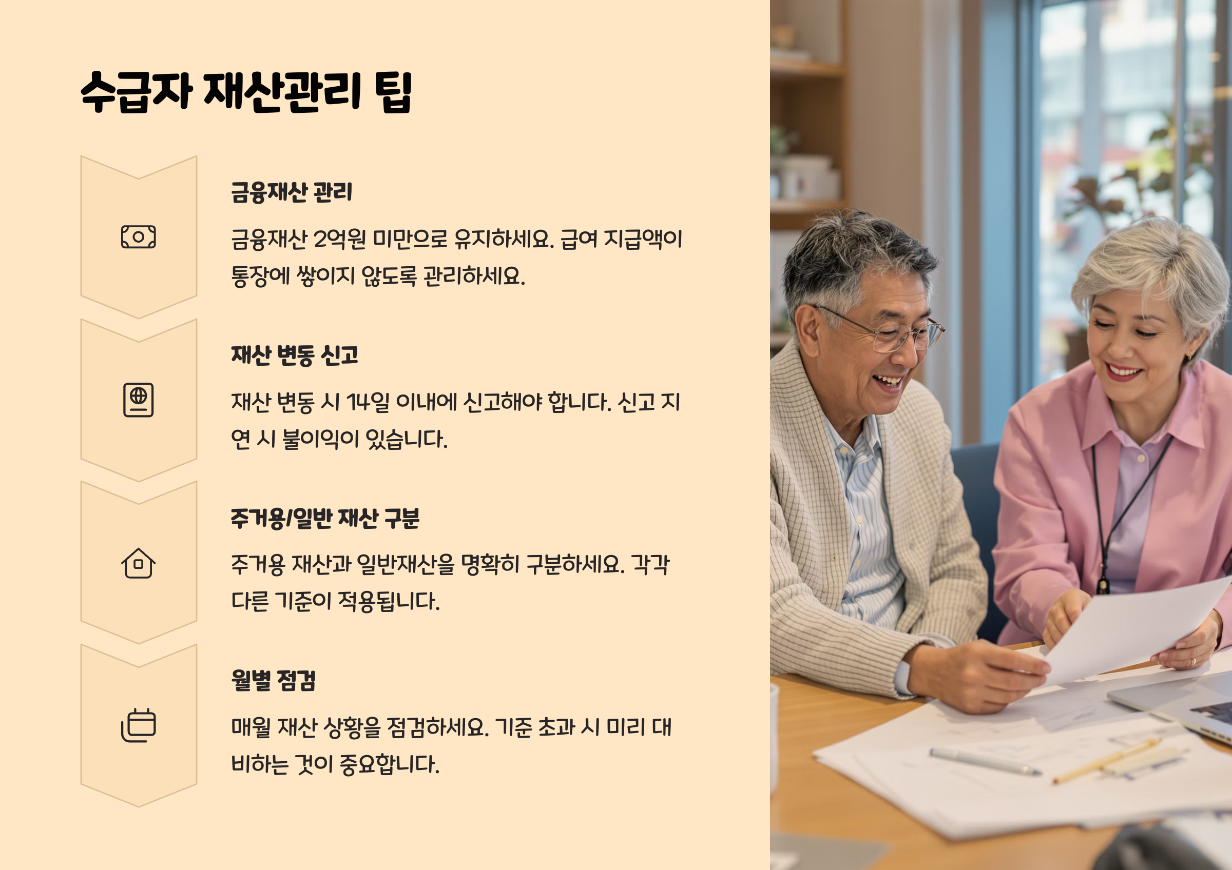 또한 임대사업자 등록을 했거나, 집을 여러 채 가지고 있다면 기준을 초과해 수급 대상에서 제외될 수 있어요. 특히 월세 수입이 발생하면 소득으로 잡히기 때문에 주의해야 해요! 💡