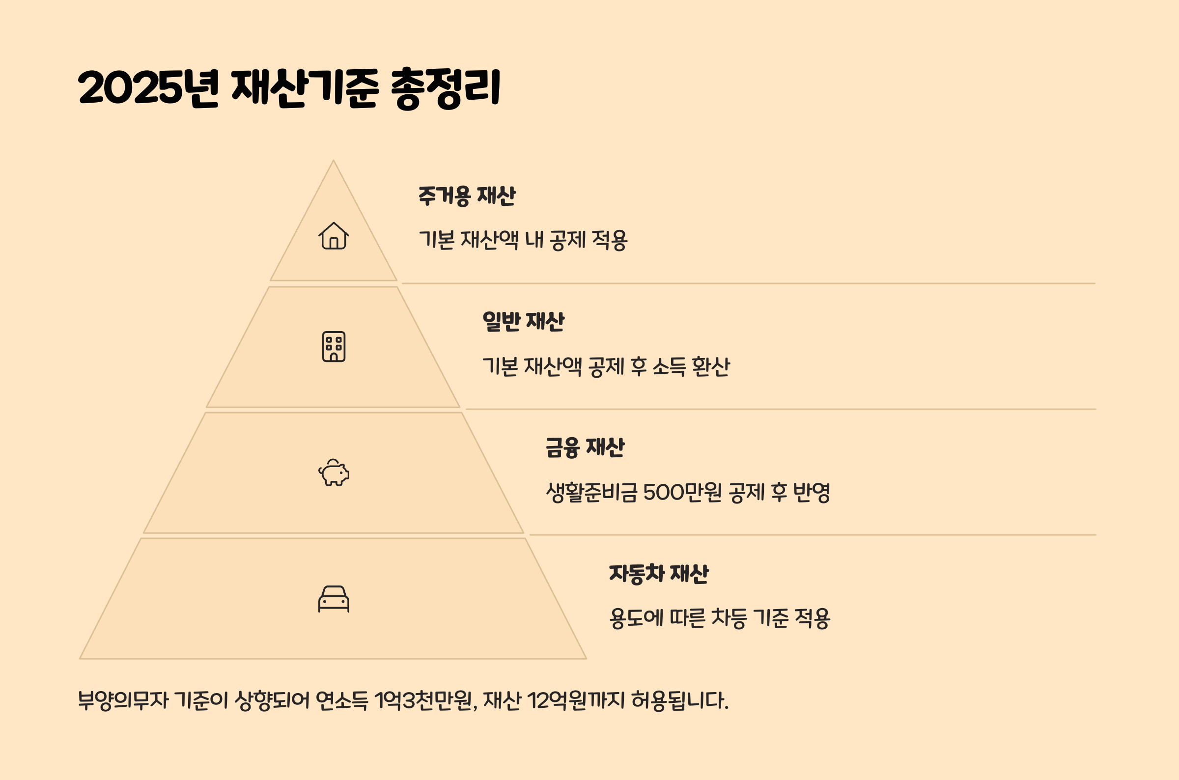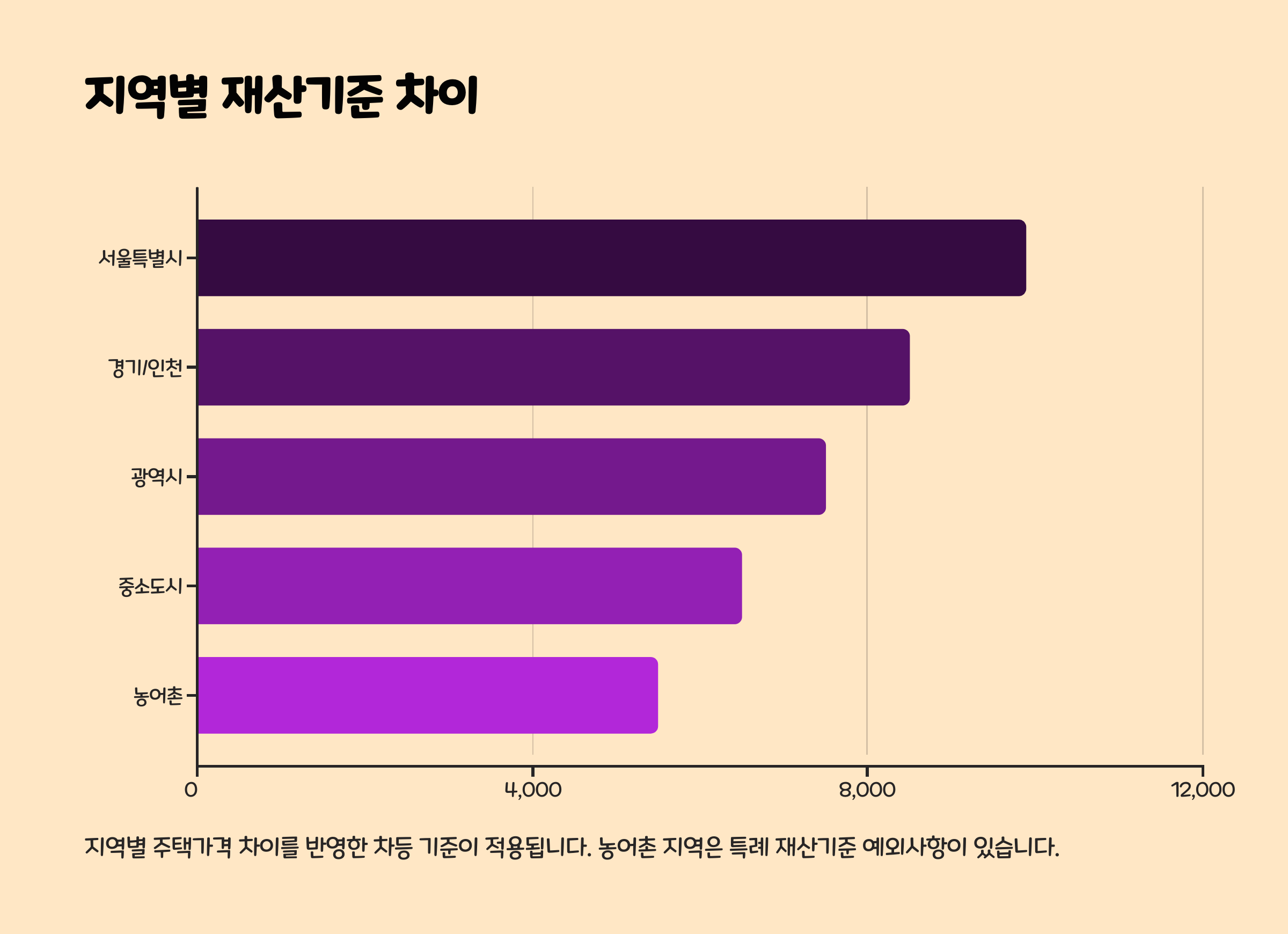2025년 기준, 대도시는 약 7,000만 원까지 인정, 중소도시는 4,200만 원, 농어촌은 3,500만 원 정도의 재산까지는 인정되는 분위기예요. 이 기준을 초과하면 그 초과분이 소득으로 계산돼요.