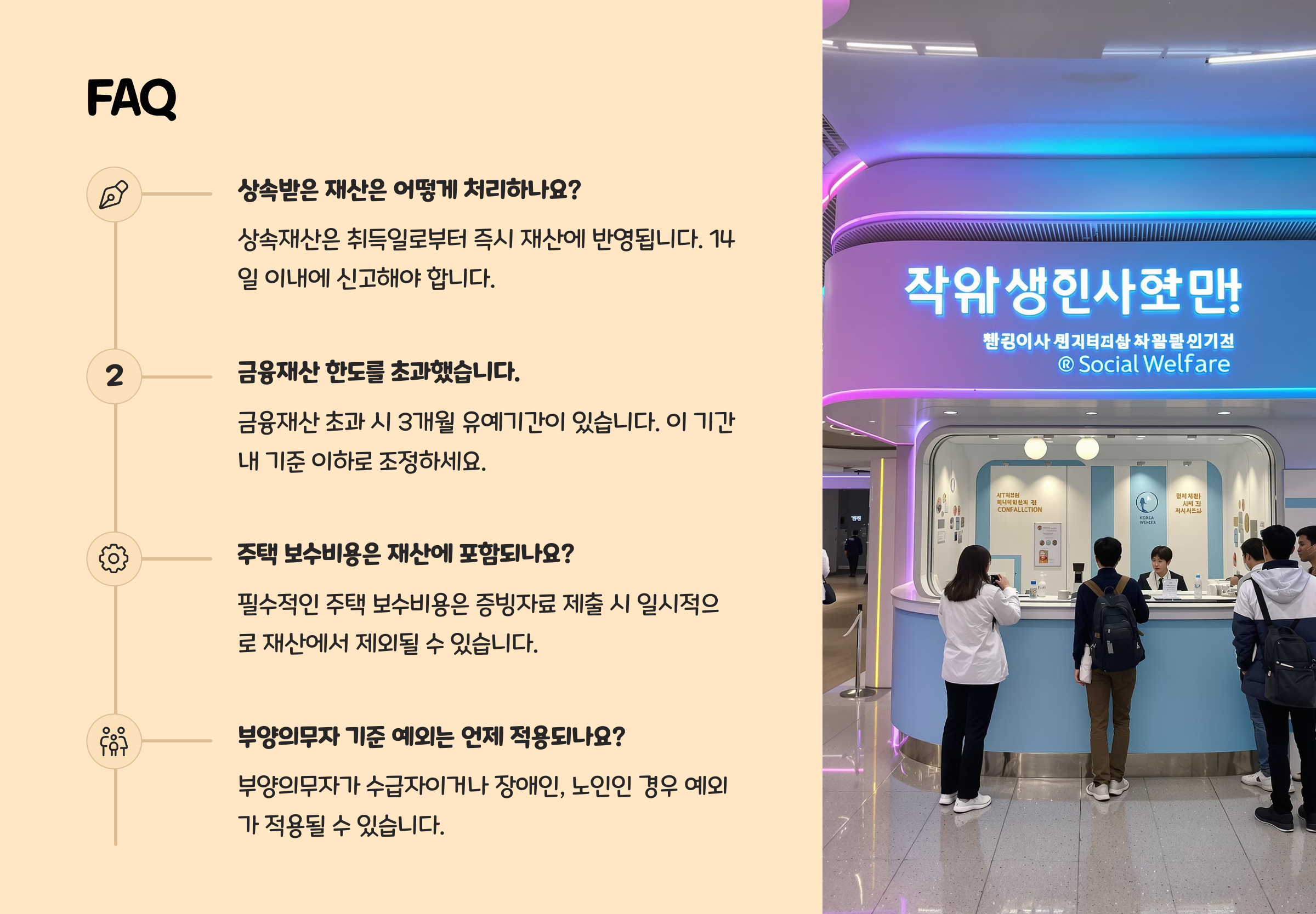 그러니까 실제 자산이 많지 않더라도 지역 기준을 넘으면 수급자 신청이 어려울 수 있어요. 주소지를 기준으로 산정되기 때문에 이사 계획이 있다면 꼭 사전 상담이 필요해요! 🗺️