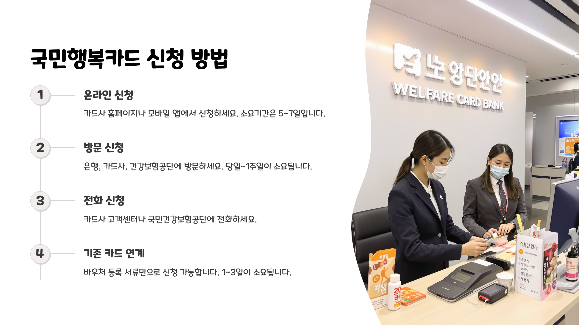 국민행복카드는 오프라인과 온라인 모두 신청 가능해서 상황에 맞게 편리한 방법으로 진행하면 돼요.