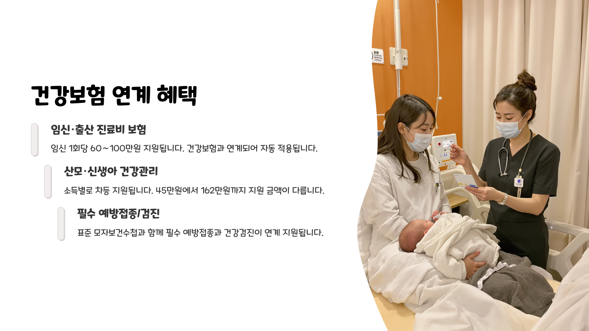 예를 들어 임신 중 고혈압, 당뇨병, 갑상선 질환 등을 관리하는 데 필요한 검사비도 혜택 범위에 들어가고요. 아이가 태어난 이후에는 건강검진, 예방접종 등에도 적용돼요.