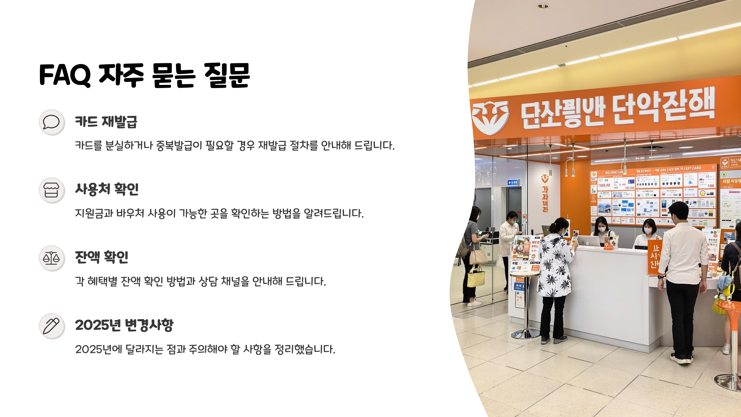 A6. 복지로 홈페이지 또는 카드사별 국민행복카드 안내 페이지에서 사용 가능한 병원, 약국, 제휴 매장을 검색할 수 있어요.