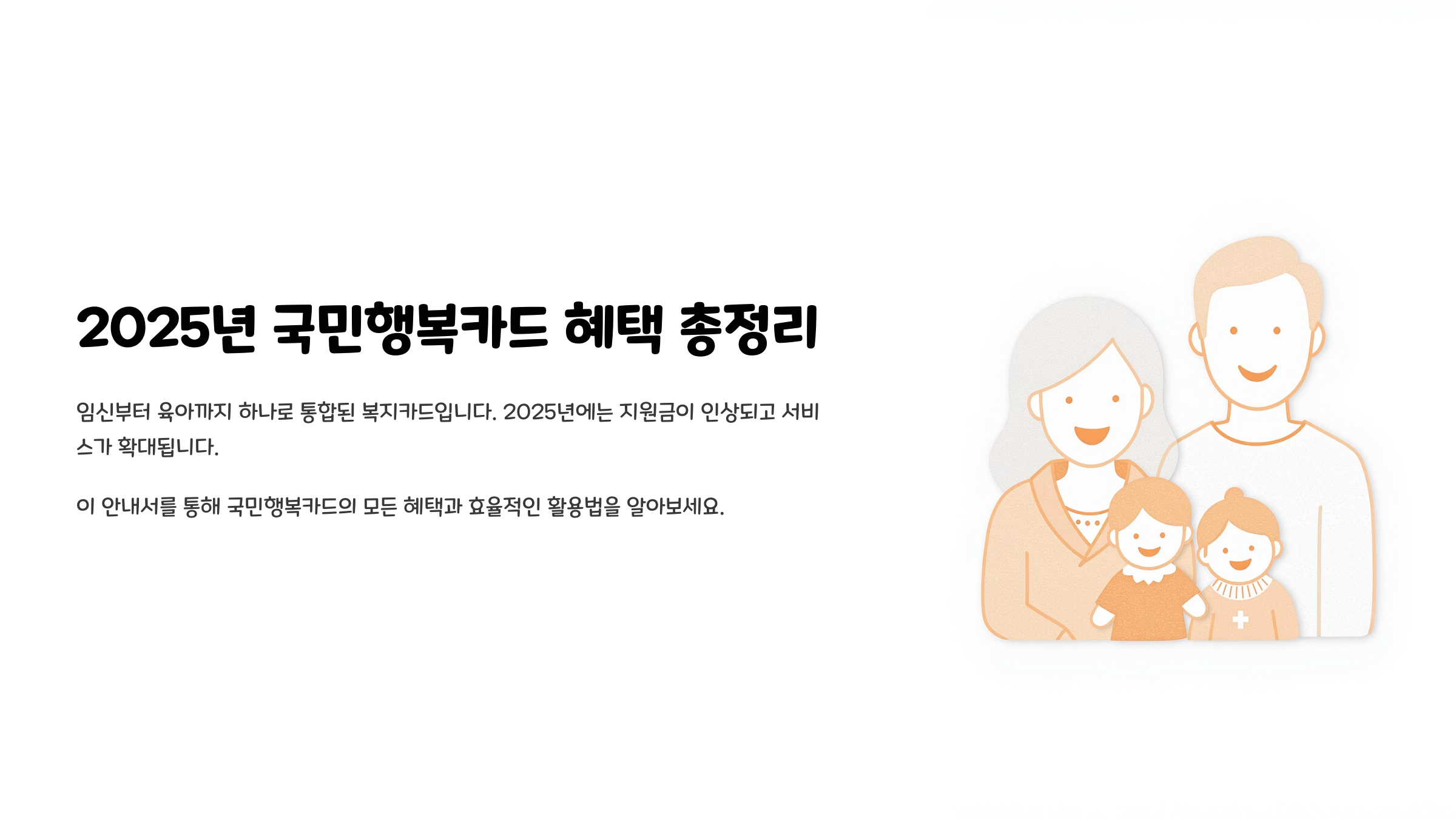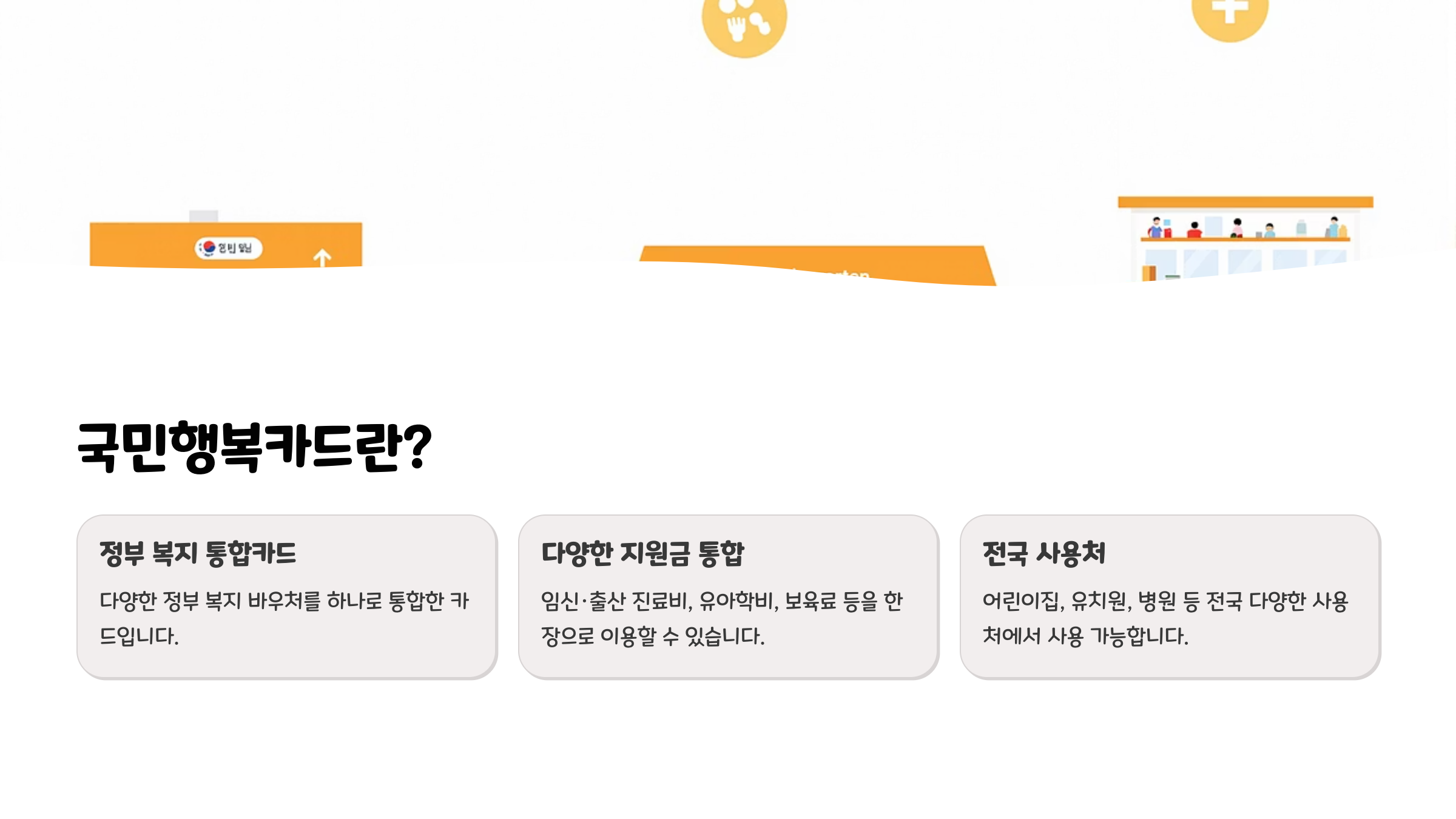 국민행복카드는 임신, 출산, 육아, 의료 등 다양한 분야에서 국가가 제공하는 지원을 하나의 카드로 통합해 이용할 수 있도록 돕는 복지 카드예요.