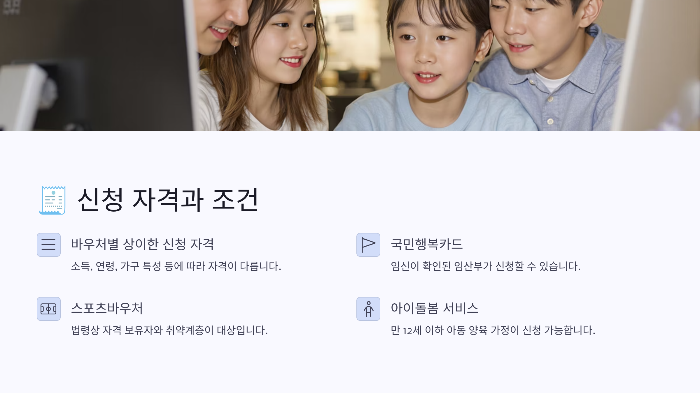 또한 바우처마다 연령, 소득, 가족 구성원 수, 고용 상태, 거주지 등에 따라 세부 조건이 붙기 때문에 사전에 확인이 꼭 필요해요. 정부24나 복지로 홈페이지에서 맞춤형 자격조회 서비스를 이용하면 손쉽게 확인 가능하답니다.