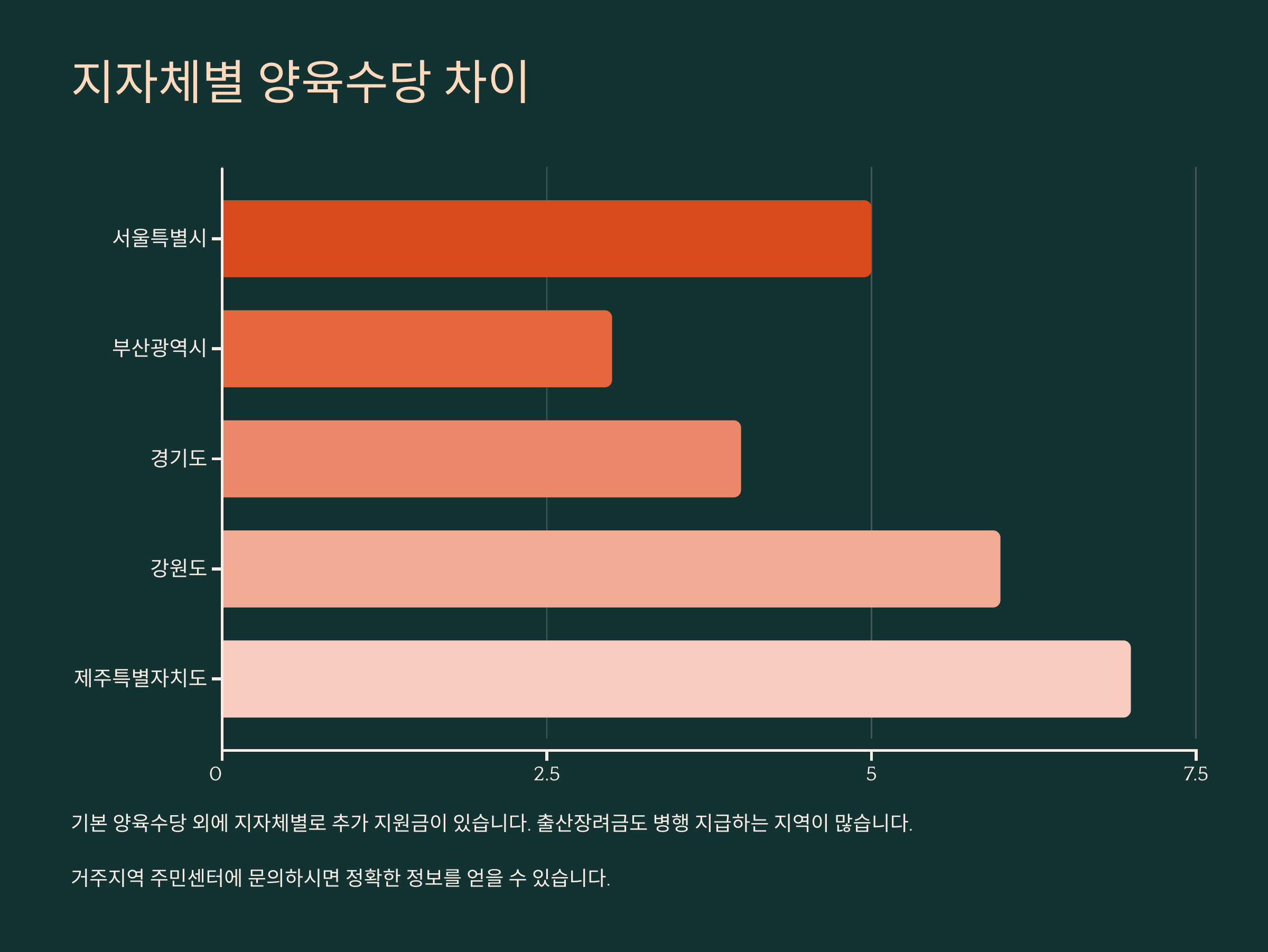 양육수당은 전국 공통으로 지원되지만, 지자체마다 추가로 제공하는 혜택은 다를 수 있어요. 서울, 경기, 부산 같은 대도시는 자체 예산으로 '추가지원금'을 지급하거나, ‘아이돌봄바우처’ 같은 별도 프로그램을 운영하고 있답니다.