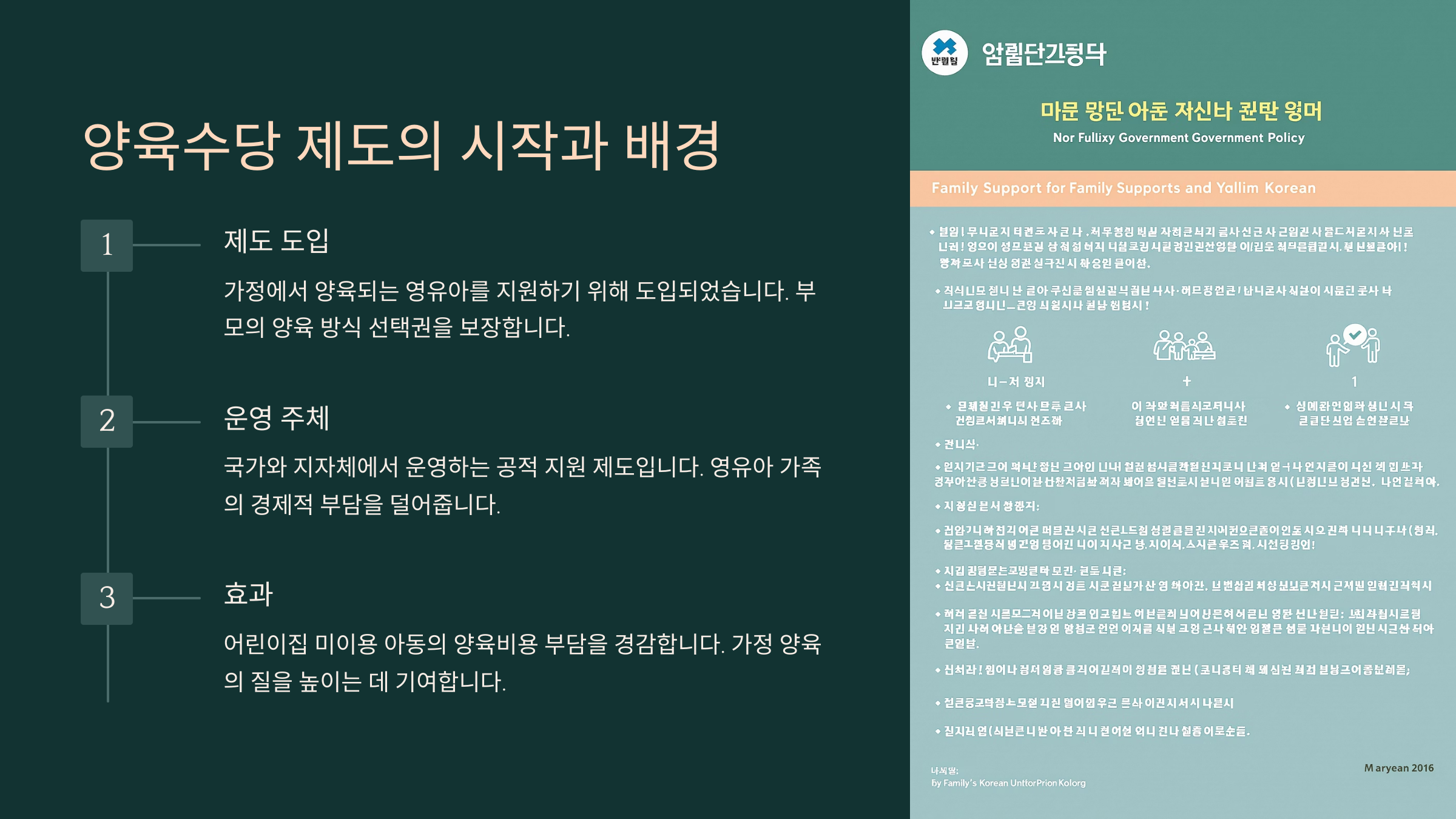 당시 정부는 ‘보육의 양극화’를 줄이고, 부모가 선택할 수 있는 보육 형태를 다양화하자는 목적에서 양육수당을 도입했어요. 특히 맞벌이 가정이 아닌 경우, 부모가 아이를 직접 돌보는 경우가 많기 때문에 이를 보완하려는 취지였죠.