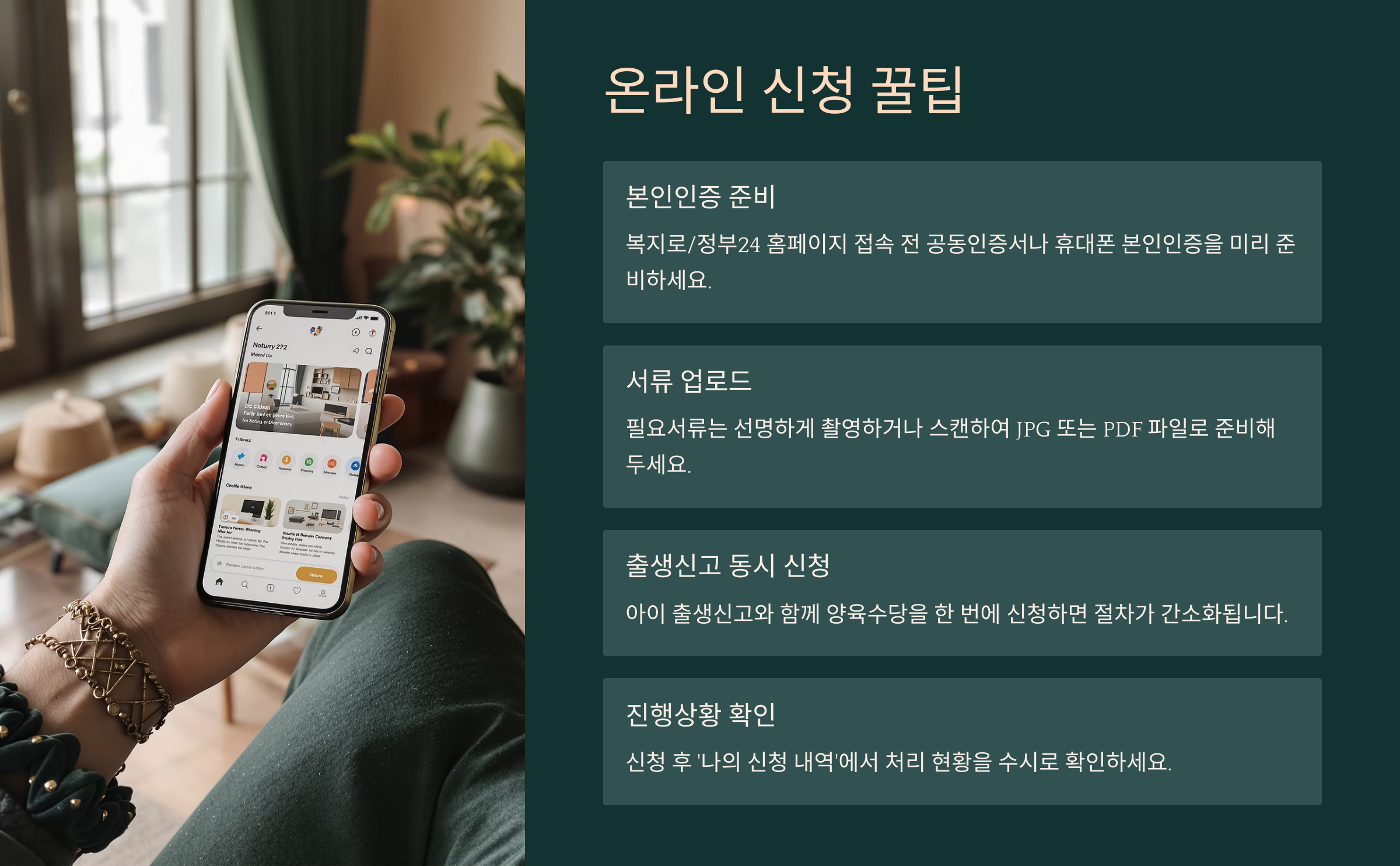 양육수당 신청은 누구에게나 열려있는 복지의 첫걸음이에요. 스마트하게 온라인으로 신청해서 시간도 아끼고 혜택도 놓치지 마세요 😊