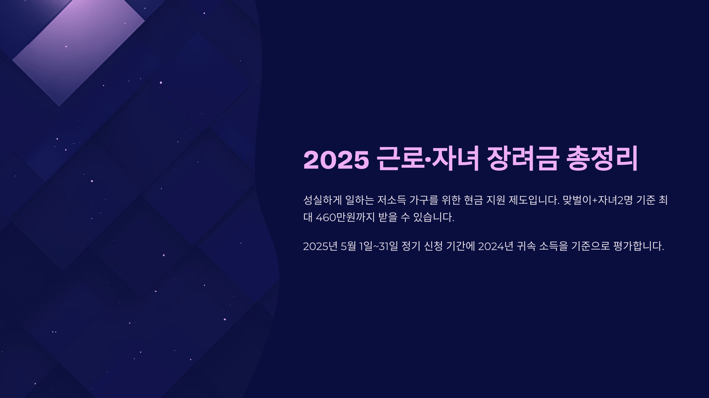 2025년 근로·자녀 장려금은 가구 유형, 소득 수준, 재산액에 따라 차등 지급돼요. 기본적으로는 '소득이 낮을수록 더 많이 받는 구조'라서, 저소득 근로자에게 가장 유리하죠.