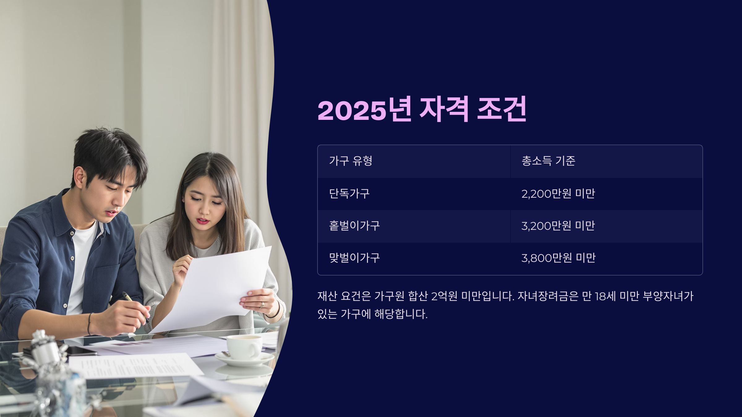 재산 기준은 2024년까지는 2억 원 이하였지만, 2025년에는 2억 2천만 원으로 완화되었어요. 물론, 재산이 1억 4천만 원 이상일 경우에는 지급액이 감액되니 유의해야 해요.