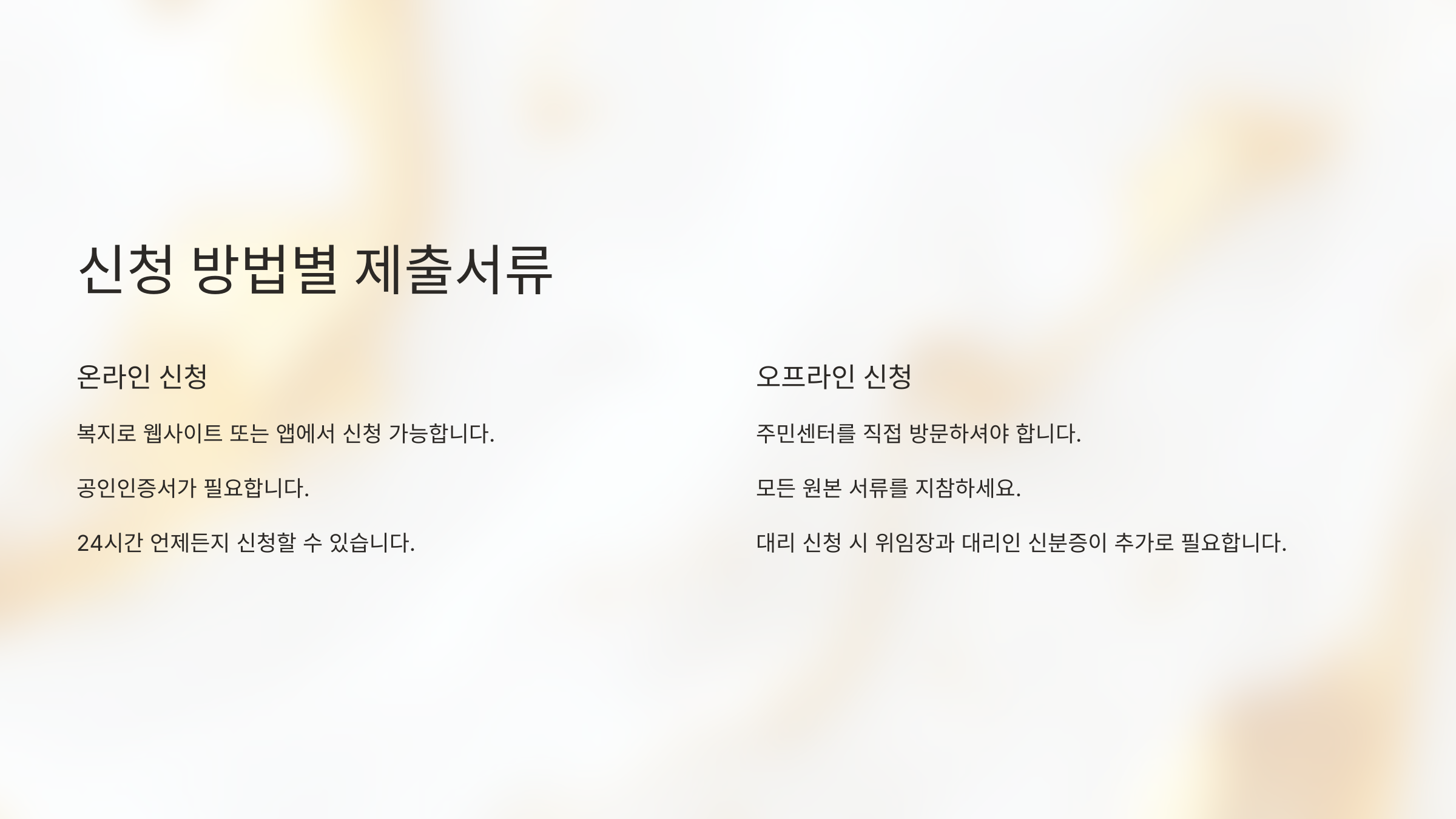 온라인 신청은 ‘정부24’나 ‘복지로’에서 가능하고, 방문 신청은 거주지 읍면동 행정복지센터에서 하면 돼요. 각각 어떤 서류를 내야 하는지 한번에 비교해볼게요.