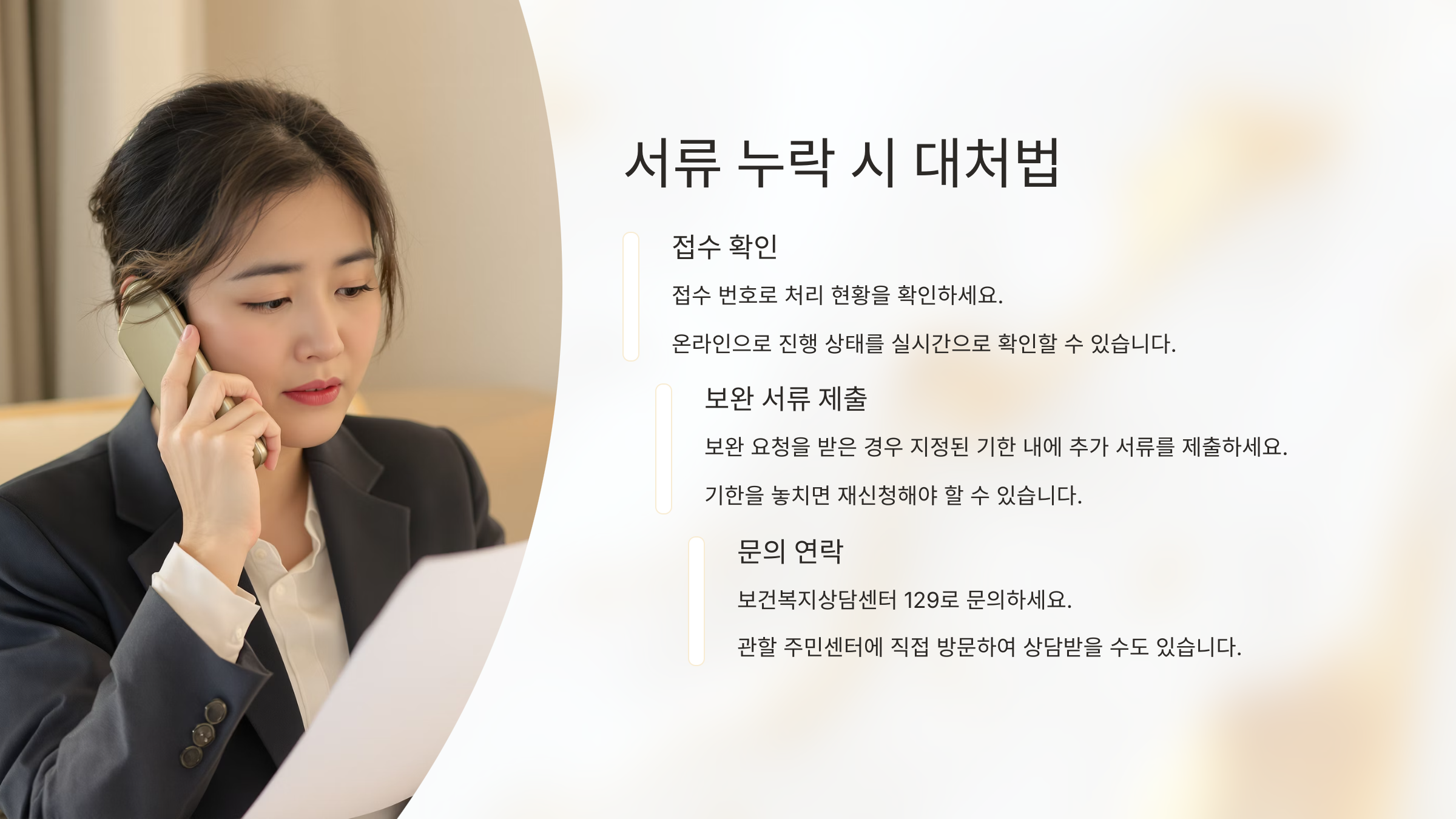 주민센터나 복지 담당자로부터 ‘보완 요청 문자’ 또는 전화가 오면, 요청된 서류만 추가로 제출하면 돼요. 따로 재신청은 하지 않아도 돼요.