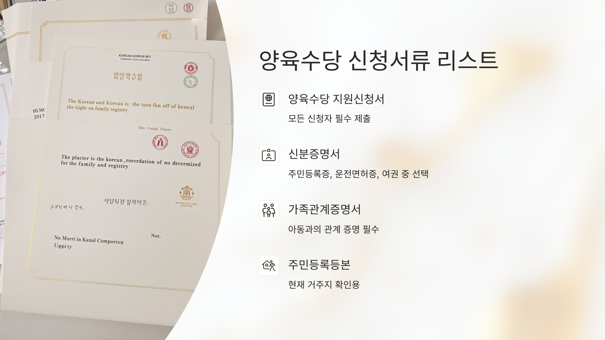 양육수당을 신청하려면 기본적으로 다음 서류들을 준비해야 해요. 신청자(보호자) 본인 확인과 아동 관련 서류가 중심이 된답니다.