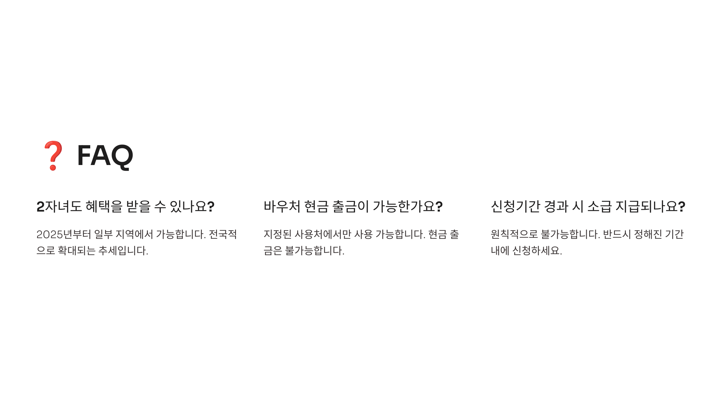A3. 현금 외에도 바우처, 육아용품, 돌봄서비스 형태로도 지급돼요.