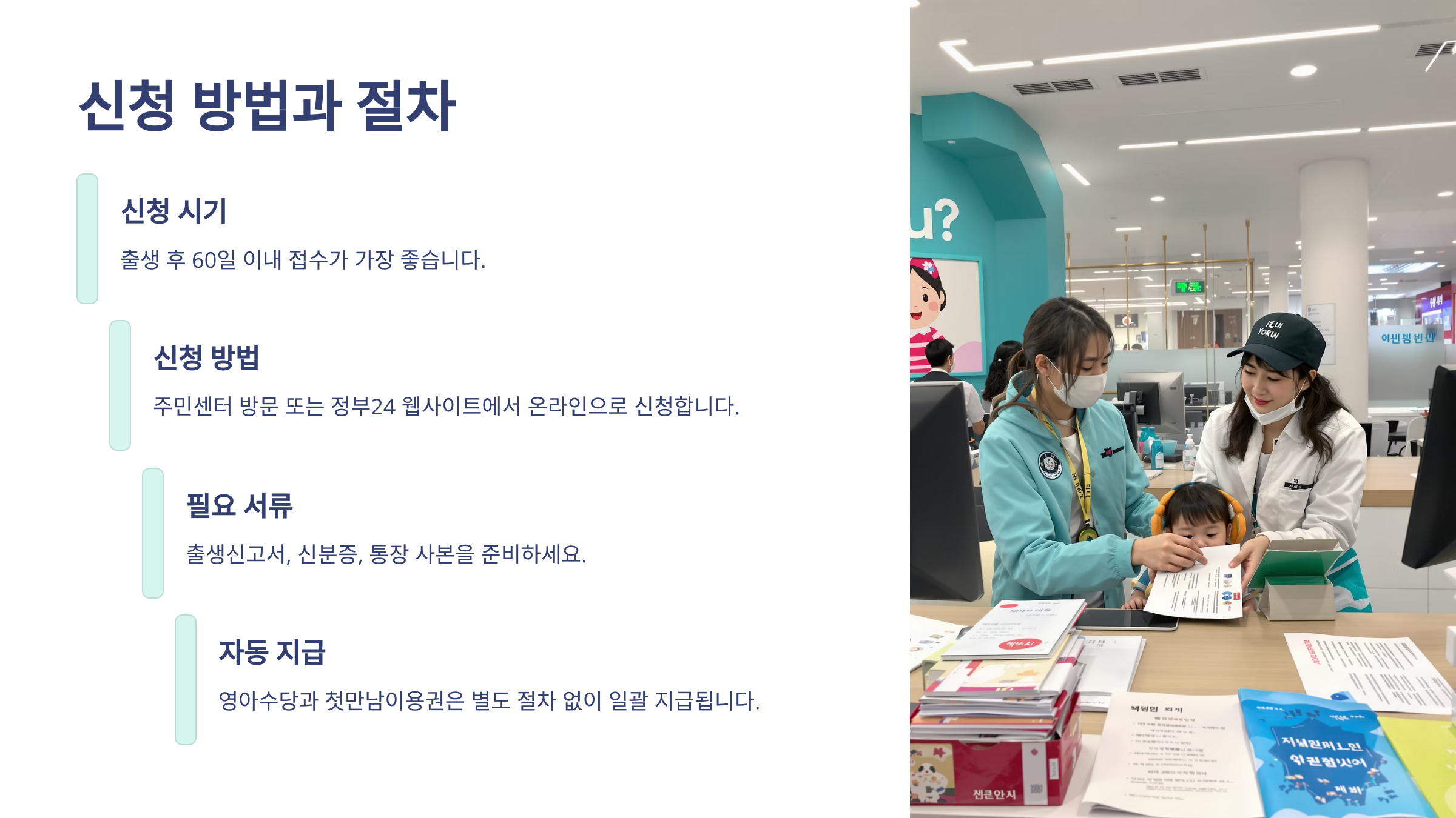 신청 시기는 보통 출생 후 1개월 이내이며, 지역에 따라 최대 3개월까지 허용되기도 해요. 하지만 가능하면 출생신고 직후 바로 신청하는 걸 추천해요. 실수로 기간을 놓치면 못 받는 경우도 있거든요.