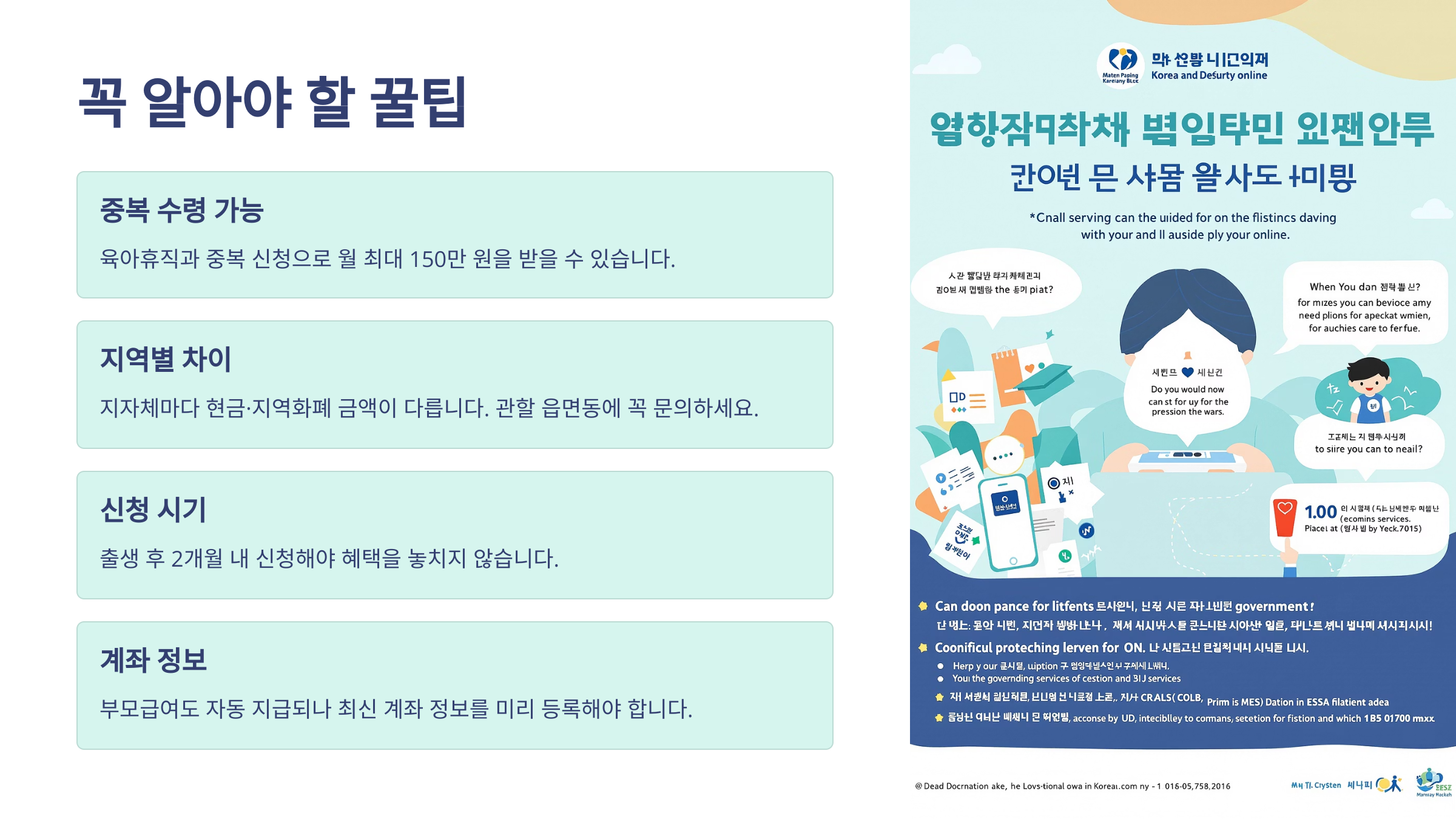 3. 중앙정부+지자체 중복 가능: 예를 들어 정부에서 주는 바우처 외에도 경기도나 충청남도에서 현금이 따로 나오는 경우가 많아요. 중복수령 가능하다는 사실! 😍