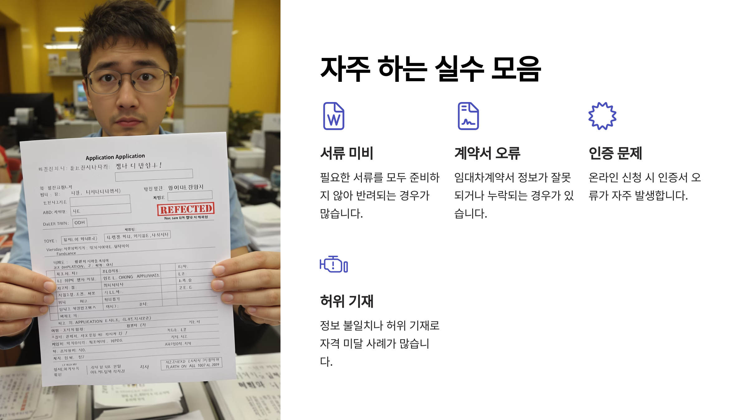 또한 임대차계약서 상의 임차인과 실제 신청인이 다를 경우도 문제예요. 가령, 세대주가 아닌 다른 사람이 계약되어 있다면 위임장을 반드시 제출해야 해요.