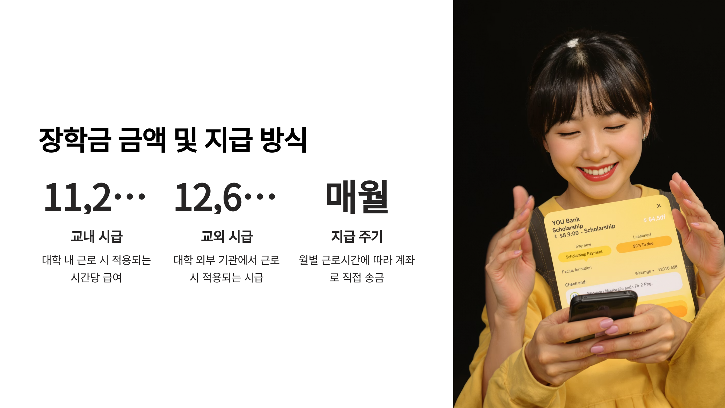 이 장학금은 등록금과는 별도로 수령하며, 과세 대상이 아닌 비과세 항목이라 세금 공제 없이 전액 수령할 수 있다는 것도 장점이에요.