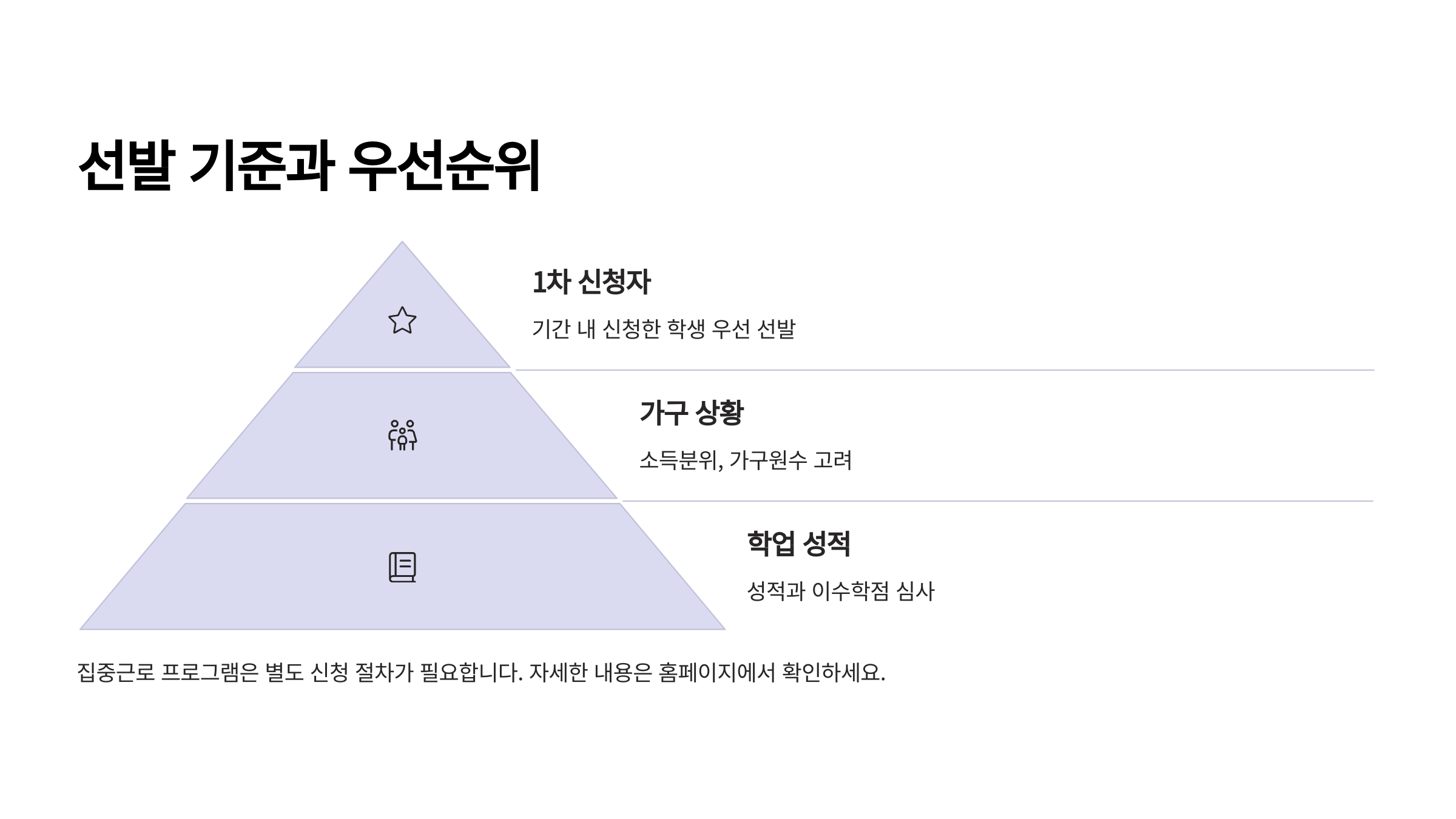 선발의 핵심은 세 가지예요. 첫째, 소득분위가 낮을수록 유리해요. 특히 기초생활수급자, 차상위계층은 자동 우선선발 대상자로 분류돼요. 둘째는 **성적**이에요. 동점자 발생 시 성적순으로 결정되죠.