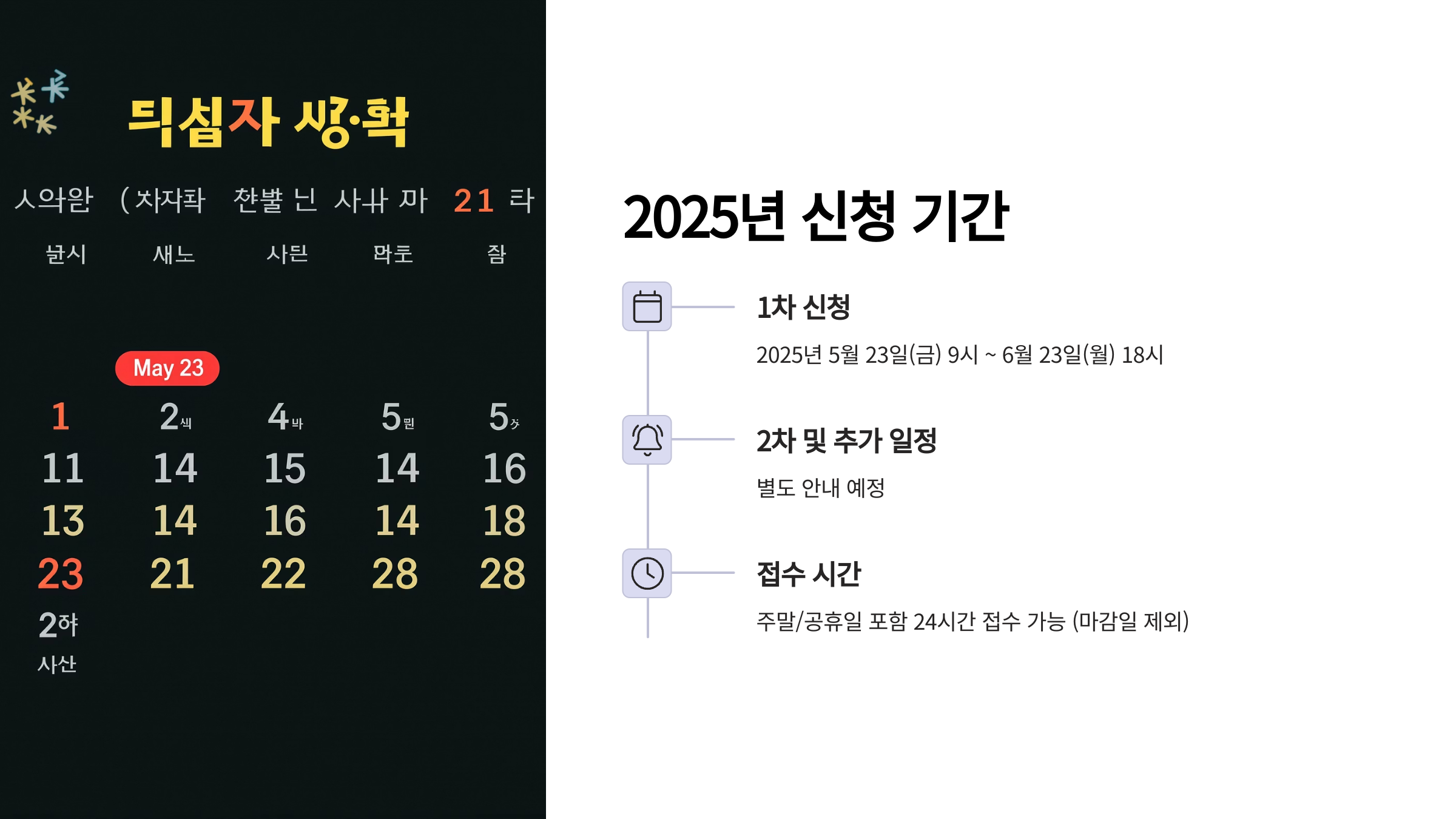 신청 마감일에는 접속 폭주로 인해 서버가 느려질 수 있으니, 미리 신청하는 것이 안전해요. 접수는 주말과 공휴일 포함 24시간 가능하지만 마감일은 오후 6시에 종료되니 주의하세요.