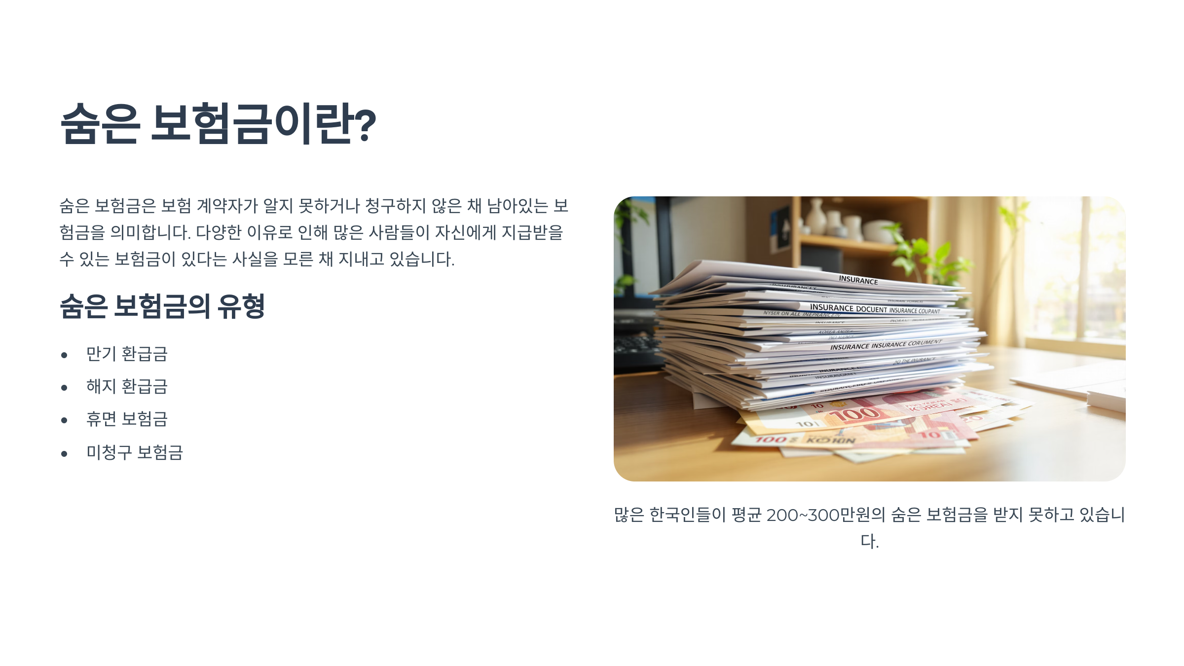 숨은 보험금이란 말 그대로 '내가 가입했지만 찾아가지 않은 보험금'을 말해요. 보험 계약은 돼 있지만 청구하지 않았거나, 만기되었는데도 지급받지 않은 금액들이죠. 놀랍게도 이런 돈이 우리나라에만 17조 원 이상이나 된다고 해요. 😳