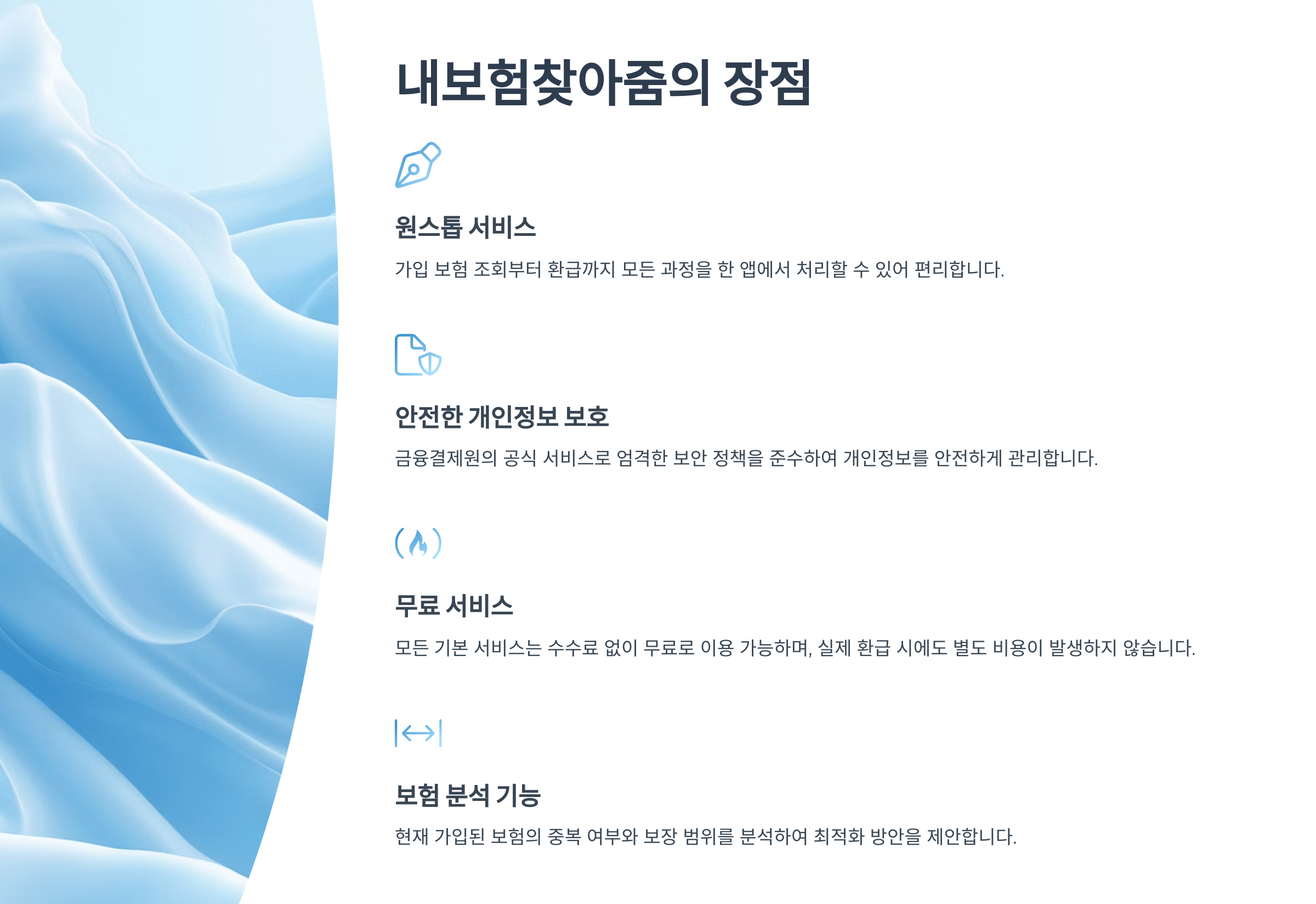 첫째, 내보험찾아줌은 '조회 서비스'만 제공해요. 환급 신청은 각 보험사에서 별도로 해야 하기 때문에 실제 환급은 보험사 홈페이지나 콜센터를 통해 진행해야 해요.