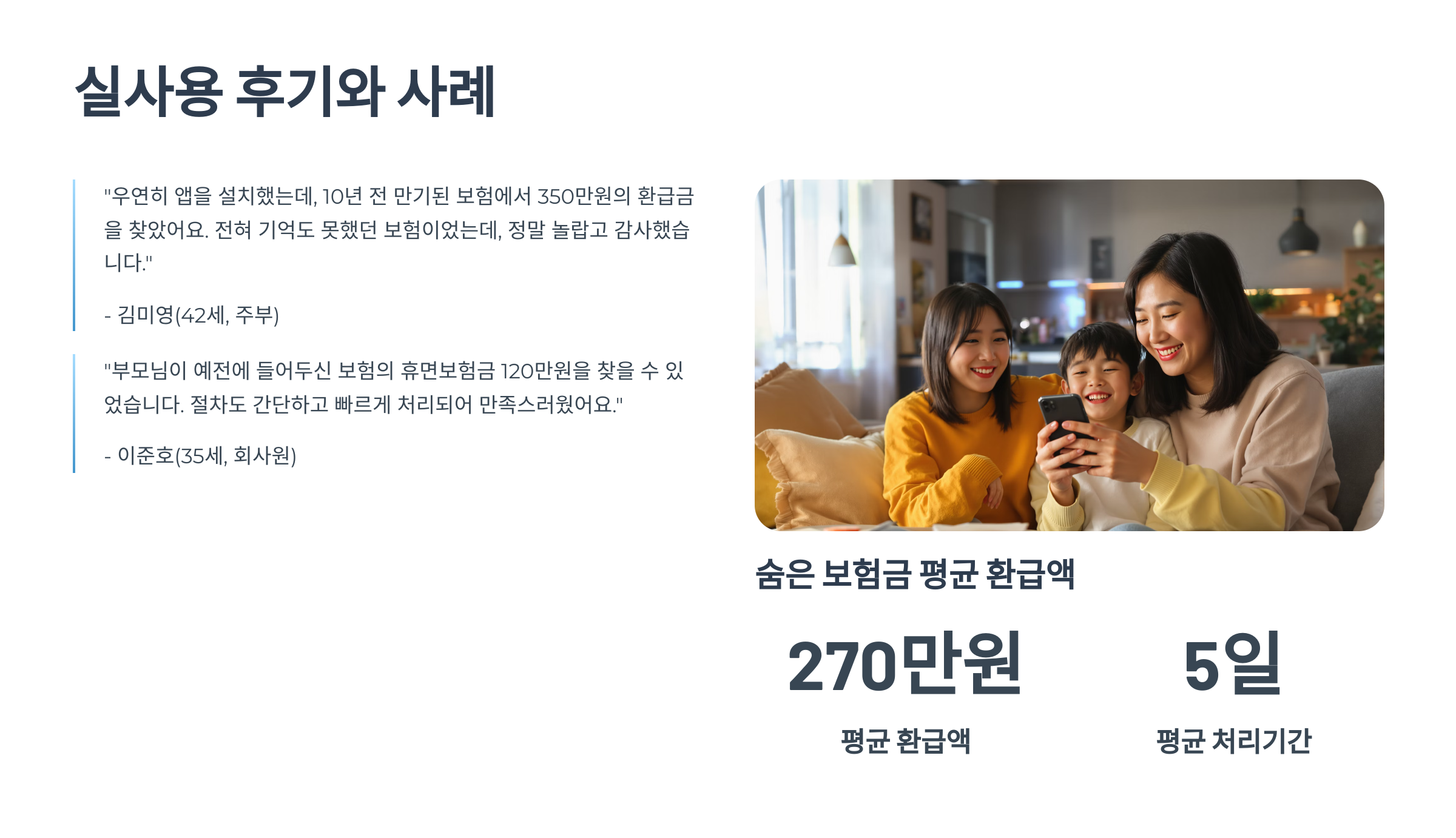 👨👩👧👦 가족 단위로 조회한 사용자 B씨는 부부가 각각 2건씩, 자녀 명의로 된 보험 1건까지 총 5건의 보험을 찾아냈어요. 그중 2건은 환급금이 50만 원 이상이었다고 해요. 한 번 조회로 온 가족이 혜택을 받은 셈이죠!