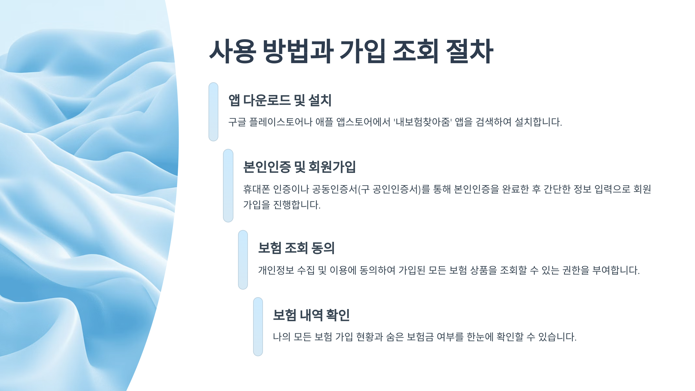 내보험찾아줌 앱이나 웹사이트를 이용하면 정말 간단하게 숨은 보험금 조회를 할 수 있어요. 사용법은 누구나 따라할 수 있을 정도로 쉬운데요, 단계별로 정리해볼게요.