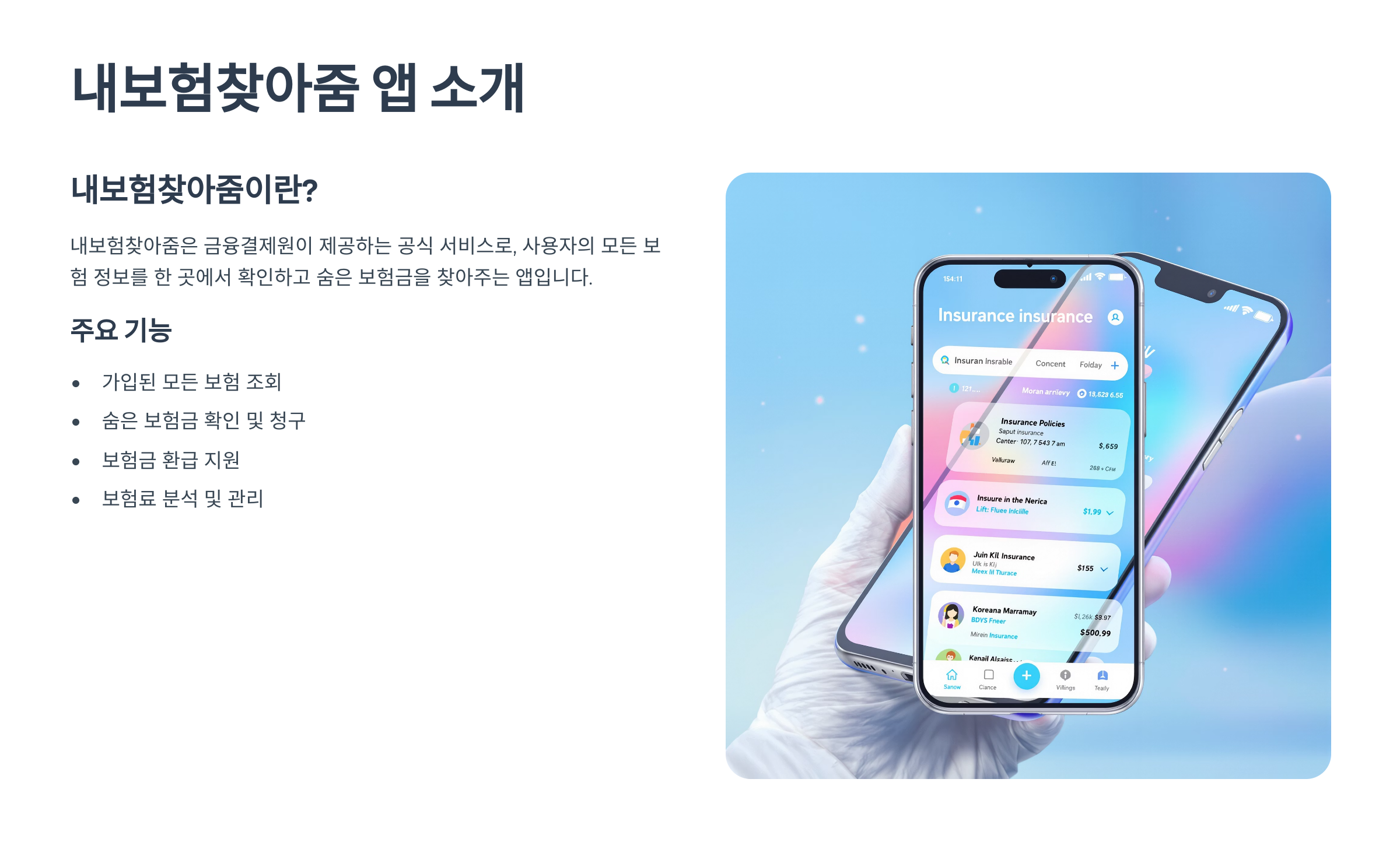 내보험찾아줌 앱은 국민 누구나 숨은 보험금을 쉽게 조회하고 환급받을 수 있도록 만든 서비스예요. 공공기관인 금융위원회와 생명·손해보험협회가 주도해 만든 만큼 믿을 수 있는 앱이에요.