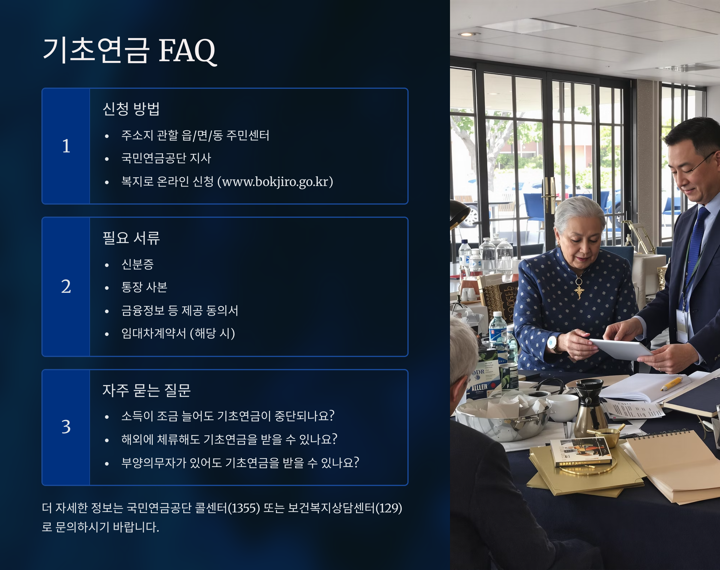 요약하면, 만 65세 이상 + 대한민국 국적 + 국내 거주 이 세 가지 조건이 충족되면 연령 및 국적 요건은 완료라고 보면 돼요. 그다음은 소득·재산 심사 단계로 넘어가게 돼요.