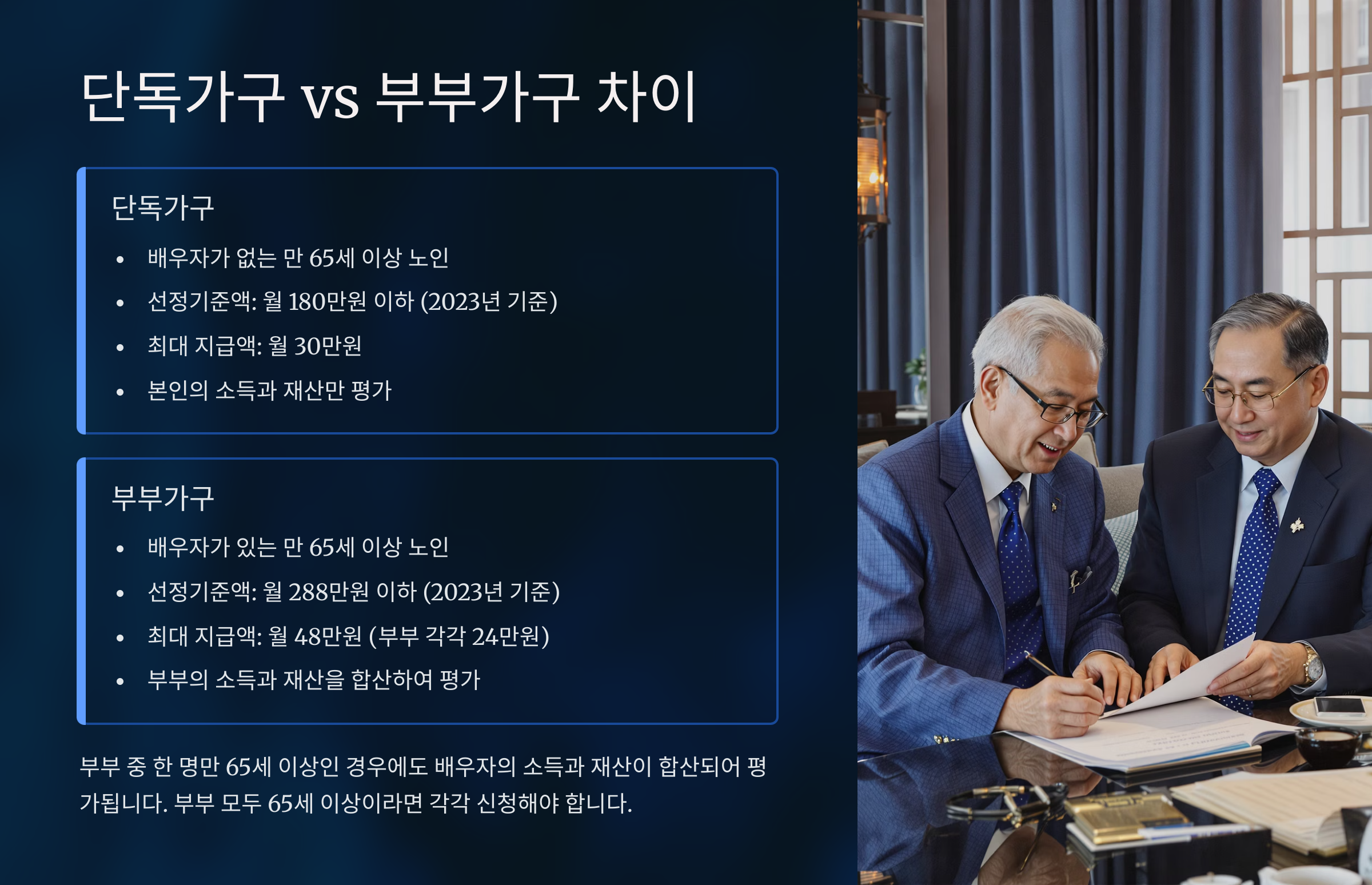 예를 들어 남편과 아내가 모두 65세 이상이고 소득·재산 기준을 만족했다면, 각자 32만 원씩 받을 수 있어요. 단독가구 기준보다 적지만, 실제로는 부부가 함께 받는 총액이 더 많기 때문에 유리할 수 있어요. 📈