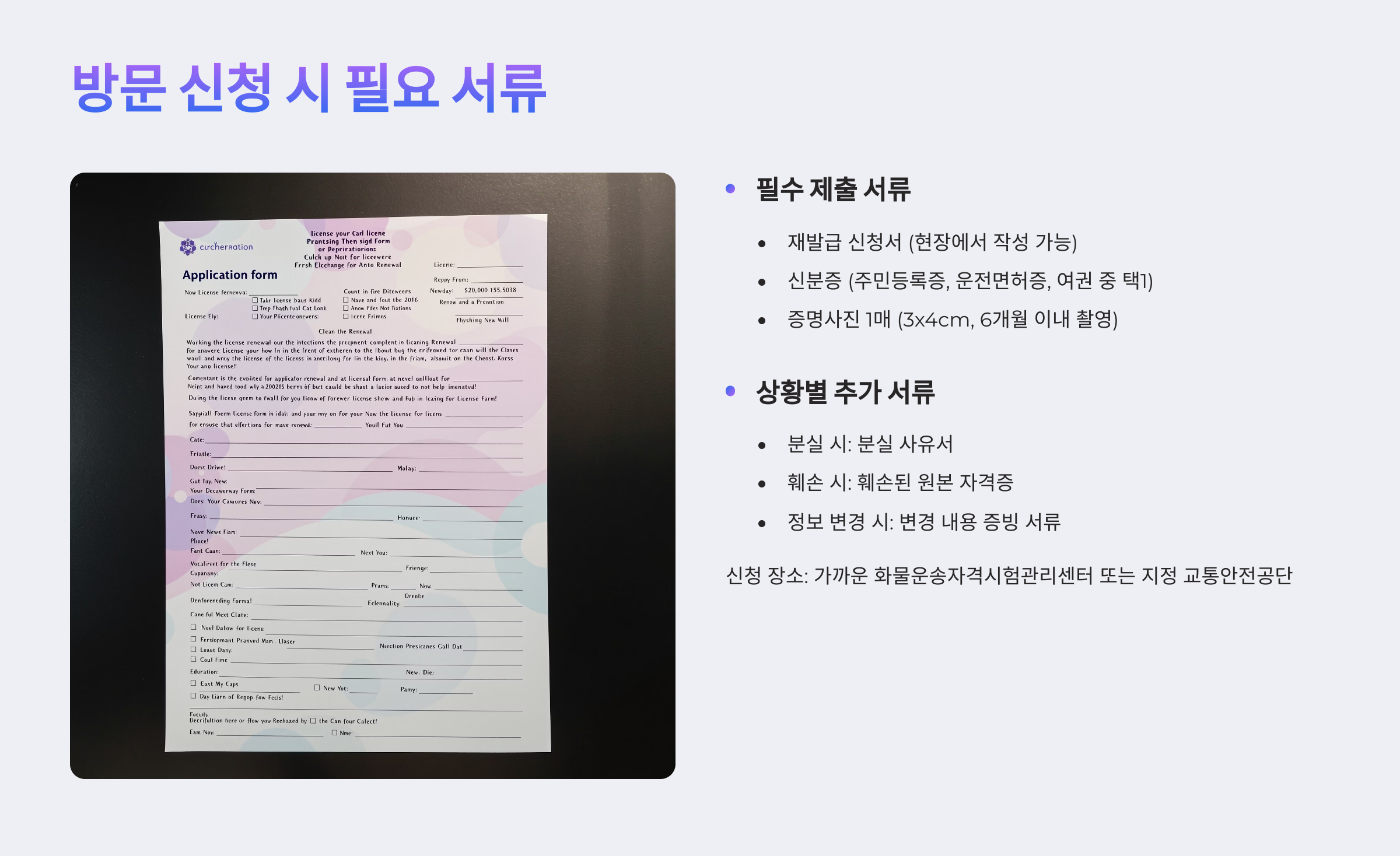 특히 분실·훼손은 가장 흔한 사유예요. 자격증이 없으면 화물 운행 중 단속 시 과태료 부과도 가능하니, 분실 즉시 재발급 절차를 밟는 게 좋아요.