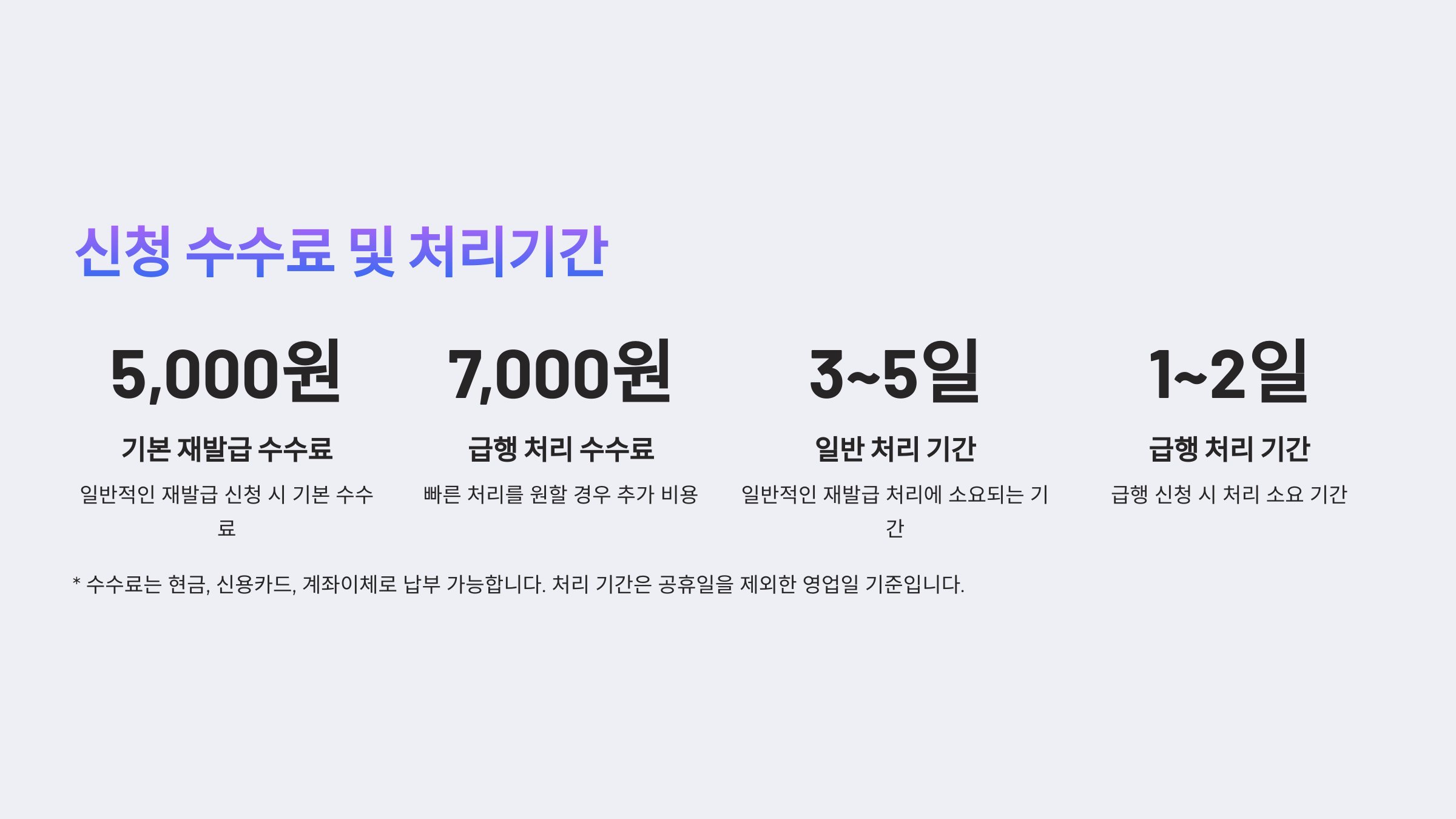 수수료는 카드 결제 또는 계좌이체가 가능하고, 방문 신청의 경우 현금 또는 카드로 납부하면 돼요. 온라인은 대부분 카드·간편결제 지원이 되고 있어요. 💳