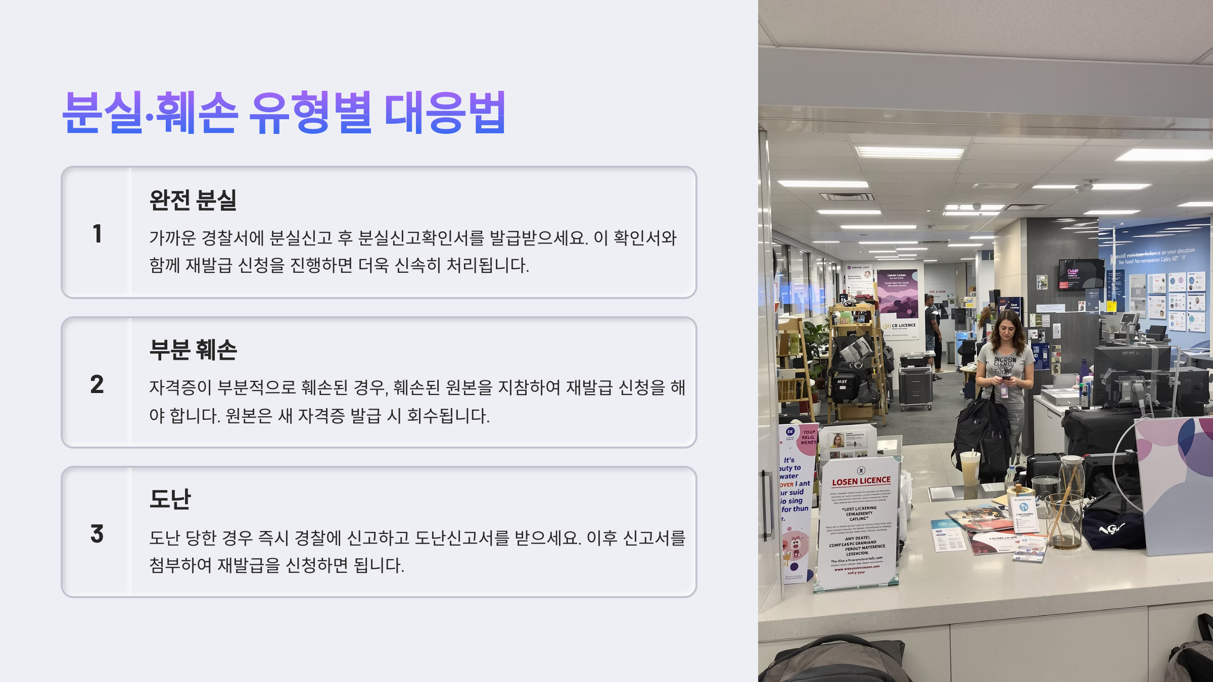| 📕 완전 분실 | 즉시 온라인/방문 신청, 자격번호 입력 필요 |