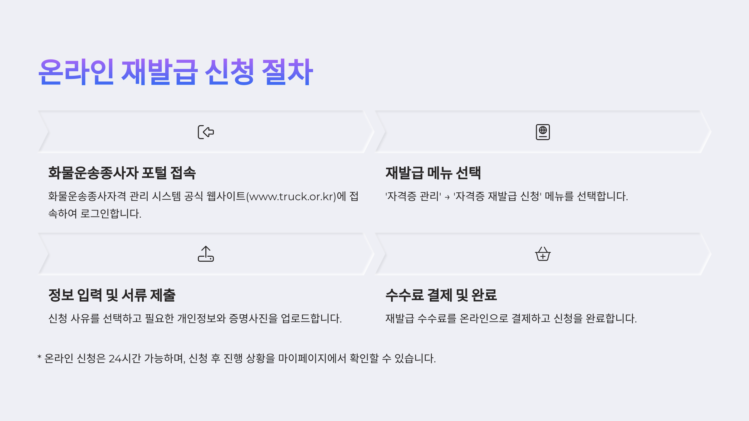 화물운송자격증은 온라인으로 간편하게 재발급할 수 있어요. 특히 시간이 없거나 바쁜 기사님들에겐 매우 유용한 방법이죠. 👨💻