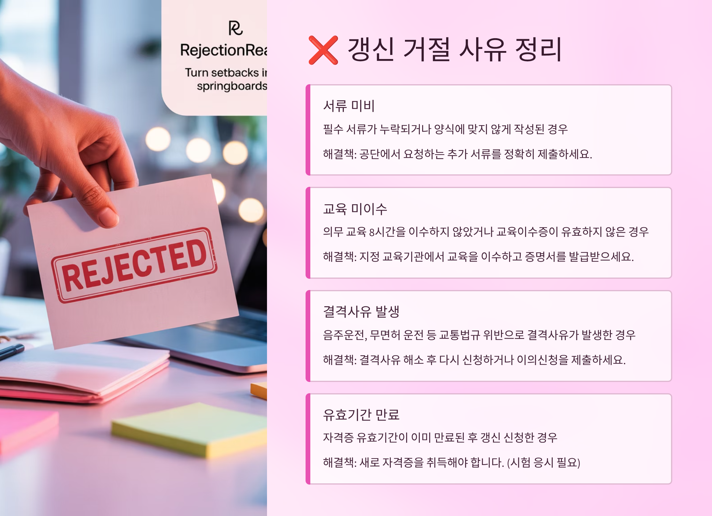 둘째, 갱신 교육 미이수. 갱신 대상자가 정해진 시간 내 교육을 이수하지 않으면 시스템 상 자동 반려돼요. 이 부분을 놓치는 분들이 은근히 많아요.