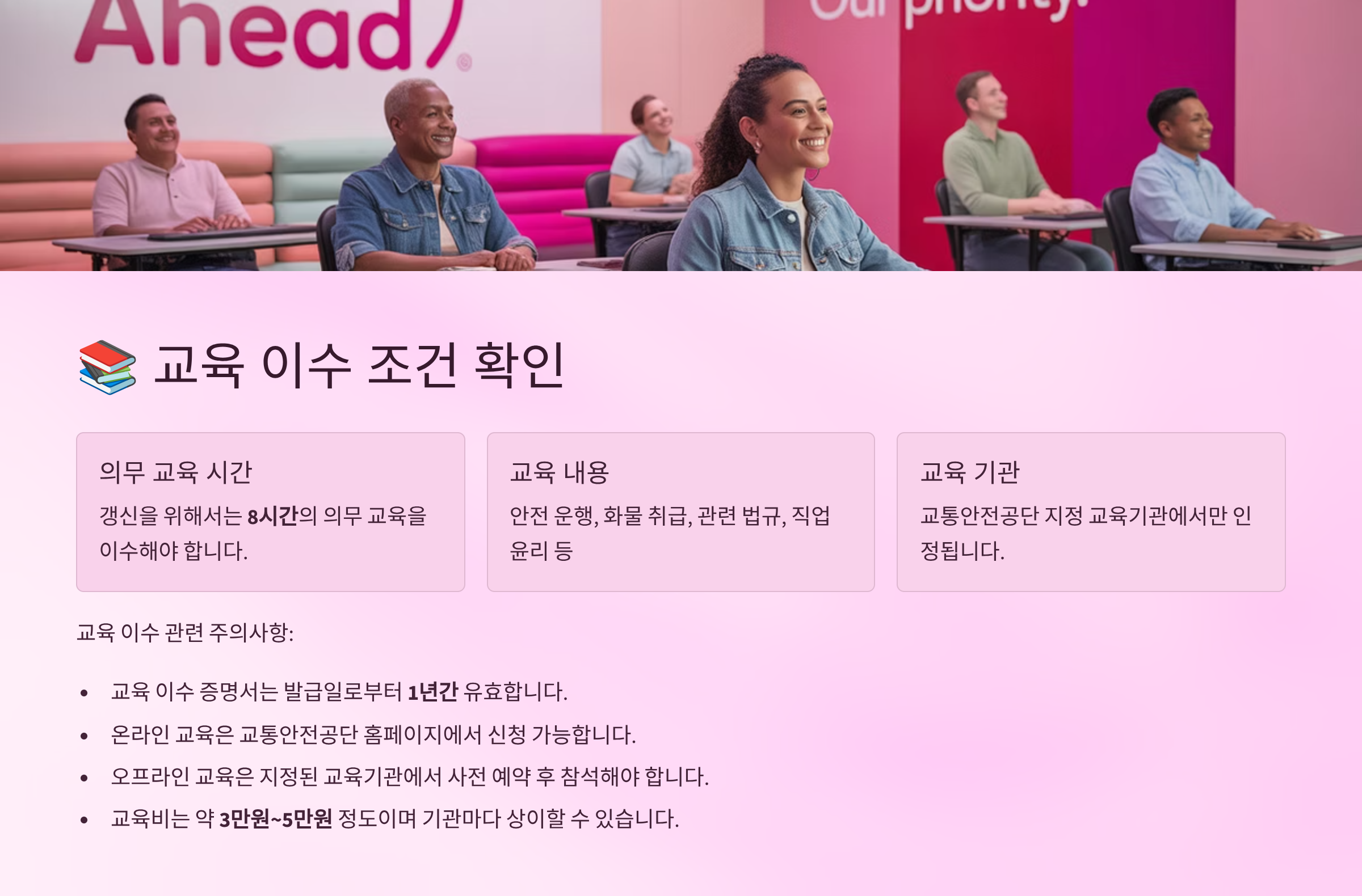 화물운송자격증 갱신을 위해서는 정해진 갱신교육을 반드시 이수해야 해요. 교육은 총 4시간에서 6시간 정도 소요되며, 출석은 전 시간 확인됩니다.